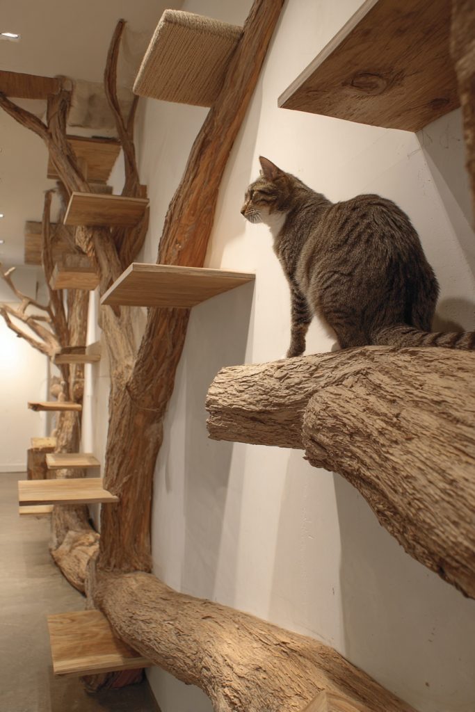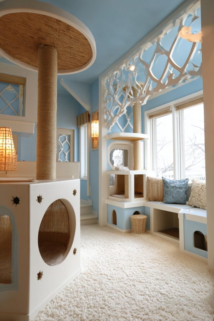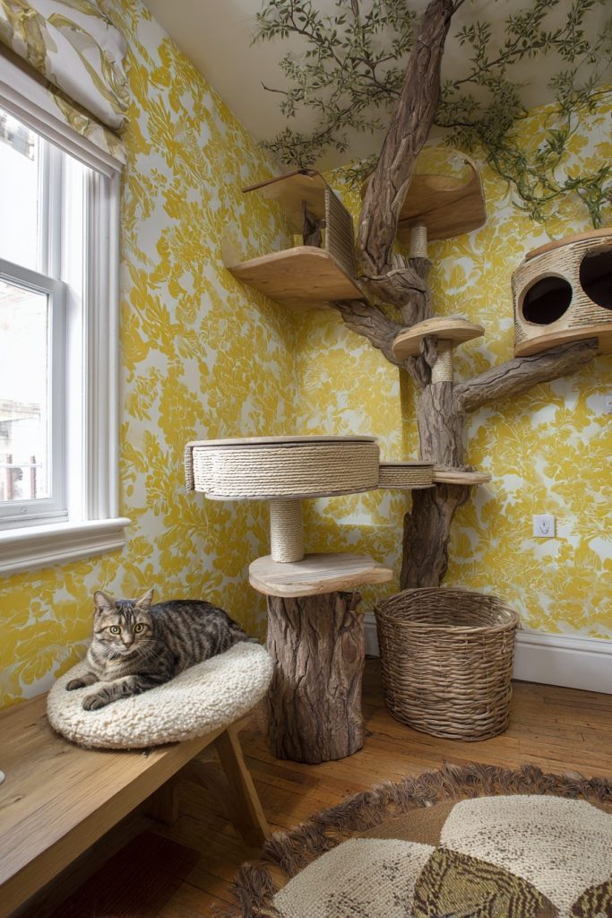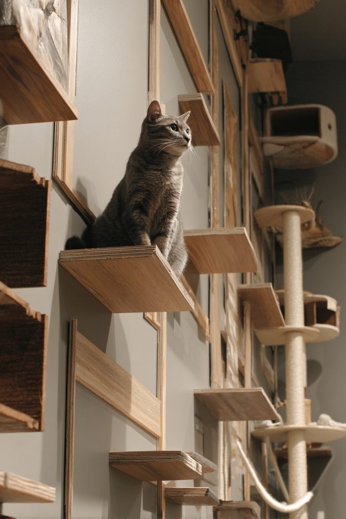 Cats naturally seek high vantage points because an elevated position gives them a deep sense of security and control over their surroundings. A vertical climbing forest can be achieved by installing a series of staggered wall shelves, floating bridges, and floor-to-ceiling cat trees that allow your pet to traverse the room without ever touching the floor. This type of layout is particularly beneficial in multi-pet households, as it provides extra territory and helps prevent social friction between animals. By incorporating different heights and textures like sisal or natural wood, you are creating a dynamic environment that encourages healthy exercise and satisfies their ancestral urge to survey the land from a safe, lofty perch. It transforms a standard room into a three-dimensional playground that keeps their muscles toned and their minds engaged.