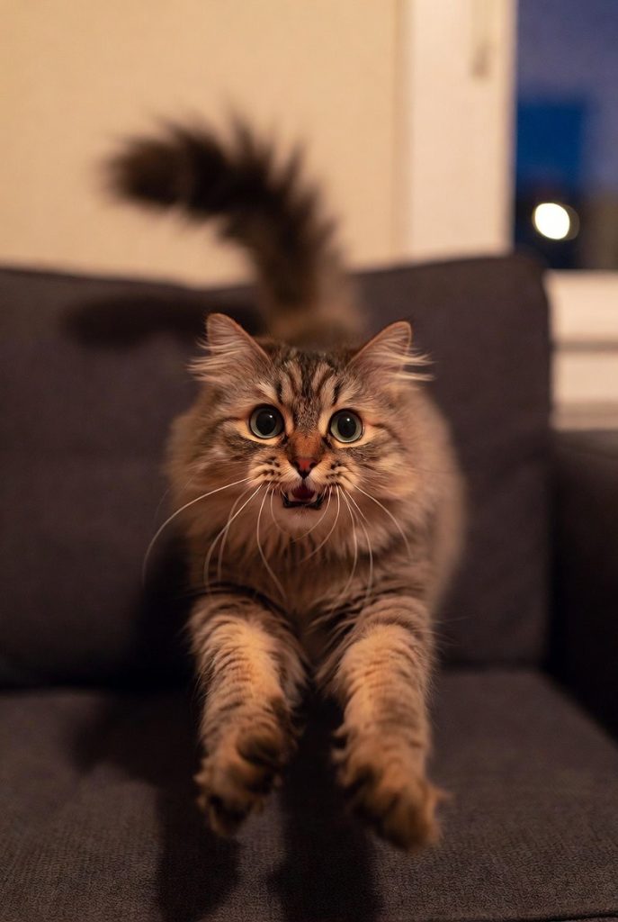 When the sun goes down and the ‘midnight crazies’ kick in, a cat’s pupils will often dilate until their eyes look like two giant, black dinner plates. This expression is usually accompanied by a slightly crazed, vibrating tail and a sudden, inexplicable need to sprint across the back of the sofa. In this state, they look like they have just seen into another dimension, one where gravity is optional and everything is a toy. It is a face of pure, caffeinated chaos.