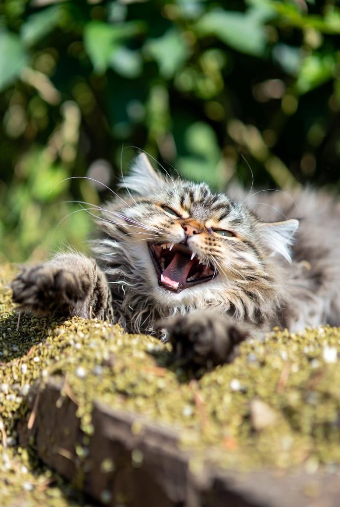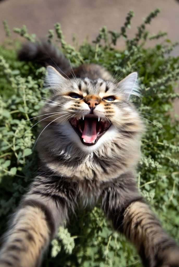When a cat is truly happy and rolling around in a patch of catnip, they often end up on their back with their head tilted at an impossible angle. From this perspective, their mouth forms a natural, slightly toothy ‘smile’ that makes them look like a very fuzzy, very drunk bat. Gravity pulls their jowls back, revealing a row of tiny ‘rice teeth’ and a look of absolute, gravity-defying bliss. It is the face of a creature that has successfully escaped all adult responsibilities.