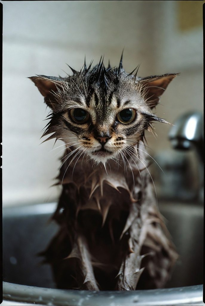 A wet cat is a hilarious cat, mostly because they lose about 75% of their volume and 100% of their dignity. Their fur sticks to them in jagged spikes, making their heads look enormous and their bodies look like tiny, soggy toothpicks. The expression of pure, unadulterated betrayal in their eyes is legendary. They look like they are already drafting a very stern letter to the authorities about the injustices they have suffered in the sink.