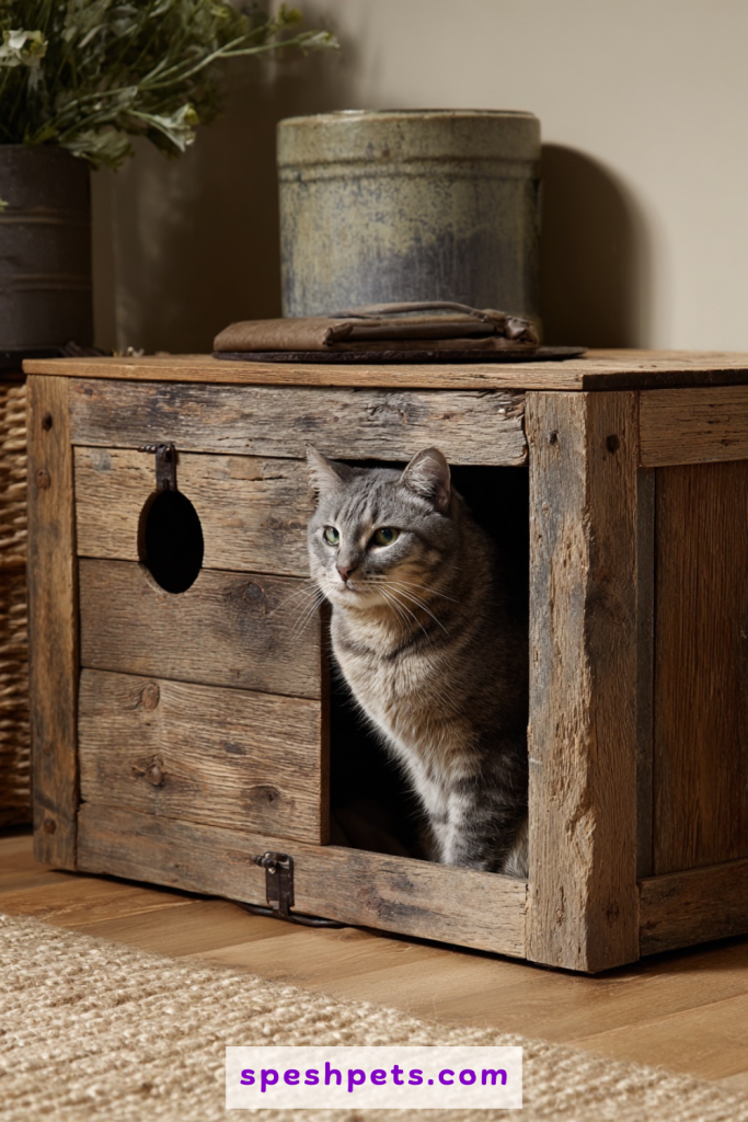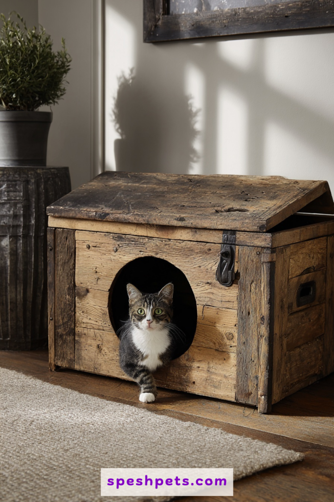 A vintage trunk or a weathered wooden chest offers a fantastic way to blend feline utility with antique charm. By carefully cutting a circular entry hole into the side or back, you transform a beautiful storage piece into a private sanctuary for your cat. The heavy, hinged lid provides excellent access for deep cleaning, and the sturdy wood material helps dampen the sound of digging while containing stray litter. This approach works particularly well in bedrooms or living areas where you want the litter box to look like a curated piece of furniture rather than a plastic utility item. It adds layers of character to your space while keeping the mess entirely out of sight and off the floor.