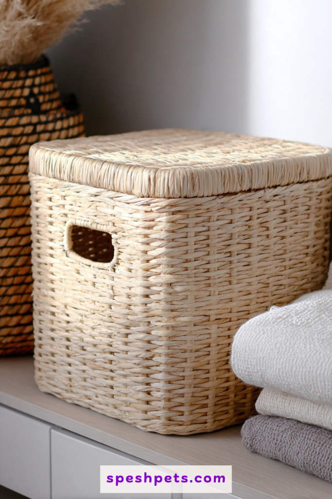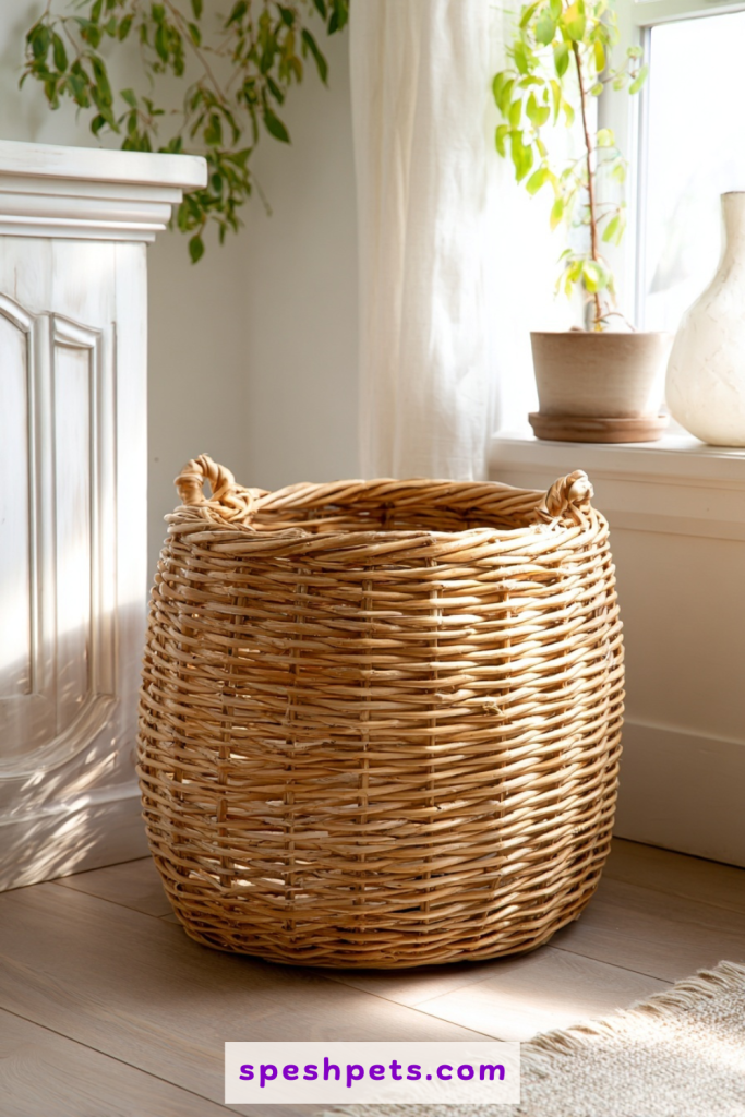 Large wicker or woven baskets offer a natural, textured look that fits perfectly with bohemian or coastal decor styles. By removing the bottom of the basket and placing it over a high-sided litter tray, you create a breathable and lightweight cover that looks like simple storage. The natural gaps in the weave provide excellent ventilation while keeping the interior obscured from sight. This is an inexpensive DIY solution that can be moved easily when you need to vacuum or rearrange the room. It softens the look of the pet area and brings an organic element into your design scheme, proving that hidden solutions can be both practical and beautiful.