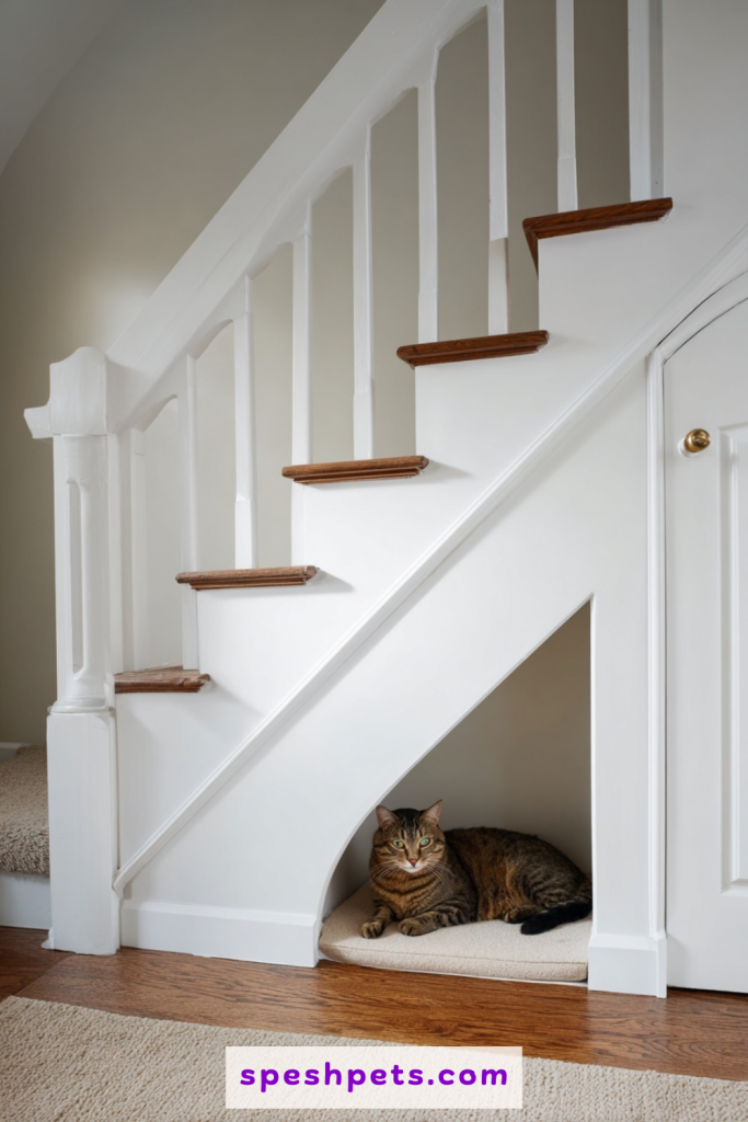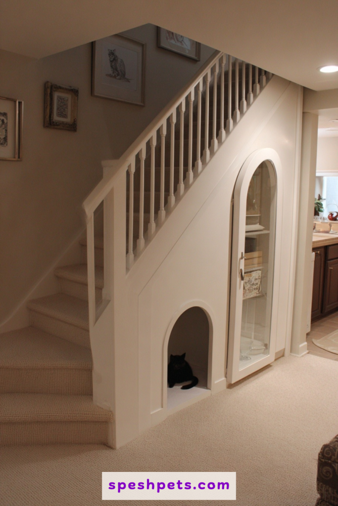 The awkward, triangular space under a staircase is a goldmine for hidden pet solutions that stay out of the main foot traffic. Often used as a dark storage closet, this area can be converted into a dedicated pet room with a built-in litter station. By installing a small arched doorway in the drywall, you give your cat a private, quiet space far away from the noise of the house. This location is excellent for odor control, as it is naturally separated from the main living areas. It utilizes architectural quirks to your advantage, turning what would be a wasted corner into a functional, hidden asset for your feline friend.