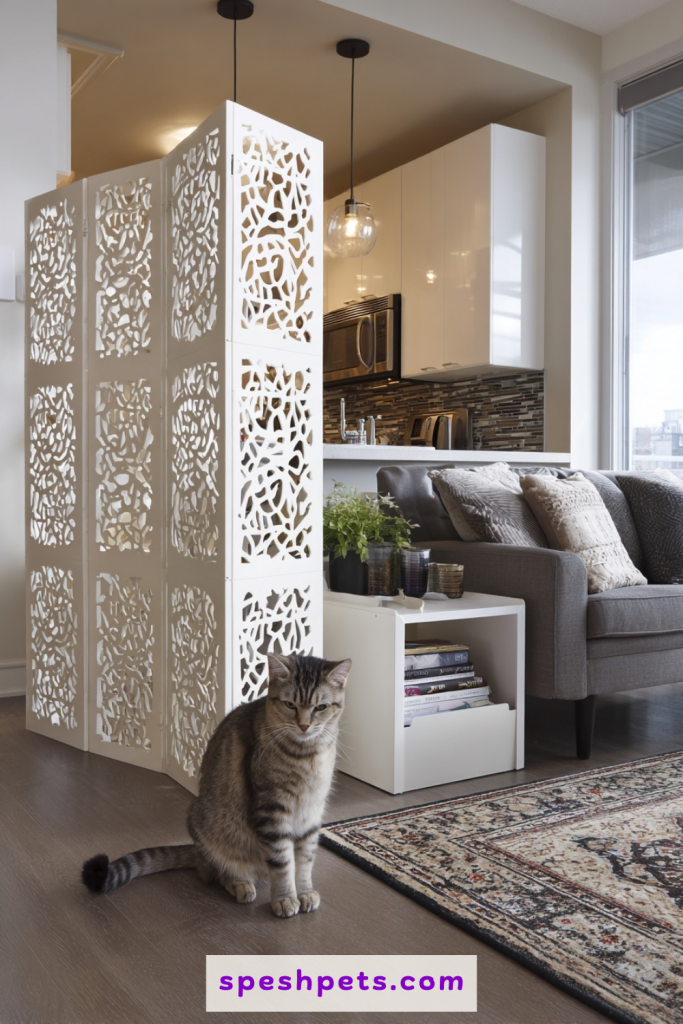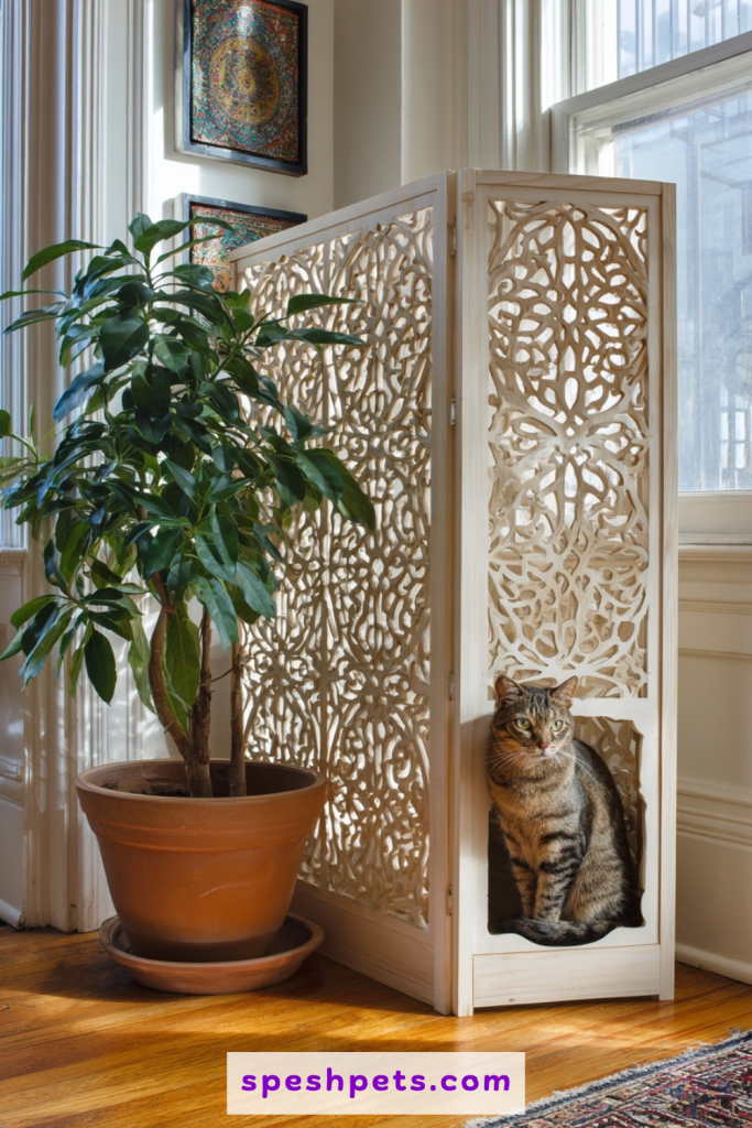 For those living in open-concept spaces or studio apartments, a decorative room divider can serve as a stylish screen for a litter box. Placing the tray behind a folding screen or a deep bookshelf creates a dedicated zone for the cat without the need for permanent renovation. This approach allows for plenty of airflow while visually blocking the utility area from the kitchen or sleeping quarters. You can choose a divider with intricate carvings or fabric panels to enhance the mood of the room. It provides the cat with a sense of security and privacy while maintaining the clean, uninterrupted lines of your living environment.
