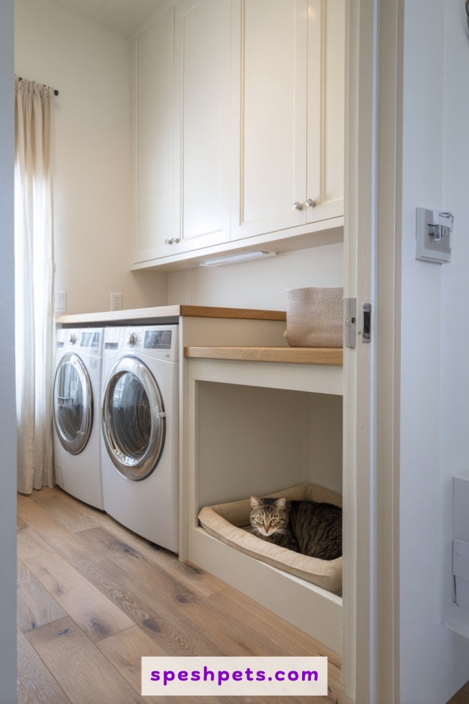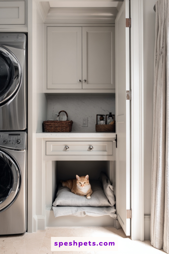 The laundry room is a natural choice for a litter box because it is already a high-functioning utility space. However, instead of leaving the box in the middle of the floor, try building a custom nook under a countertop or between the washer and dryer. This creates a designated zone that keeps the litter away from clean laundry and walking paths. You can add a small café curtain or a swinging door to further hide the box when it is not in use. Keeping the litter box in the laundry room also makes it easier to manage odors, as these rooms are typically well-ventilated and situated away from social areas.