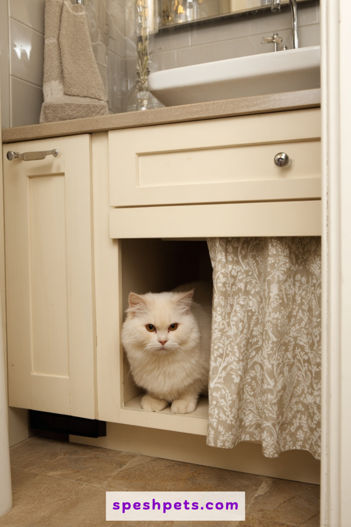The space beneath a bathroom or laundry room sink is often underutilized and provides an ideal, out-of-the-way spot for a litter box. Since these areas usually have tiled or easy-to-clean flooring, they are perfect for managing the occasional stray grain of tracking litter. By removing a cabinet door or installing a decorative curtain on a tension rod, you create a private nook that remains accessible for the cat but hidden from direct view. This location is also functionally superior, as it keeps the box near ventilation systems and water sources, making the frequent task of cleaning and maintenance much more efficient and less of a chore for a busy pet owner.