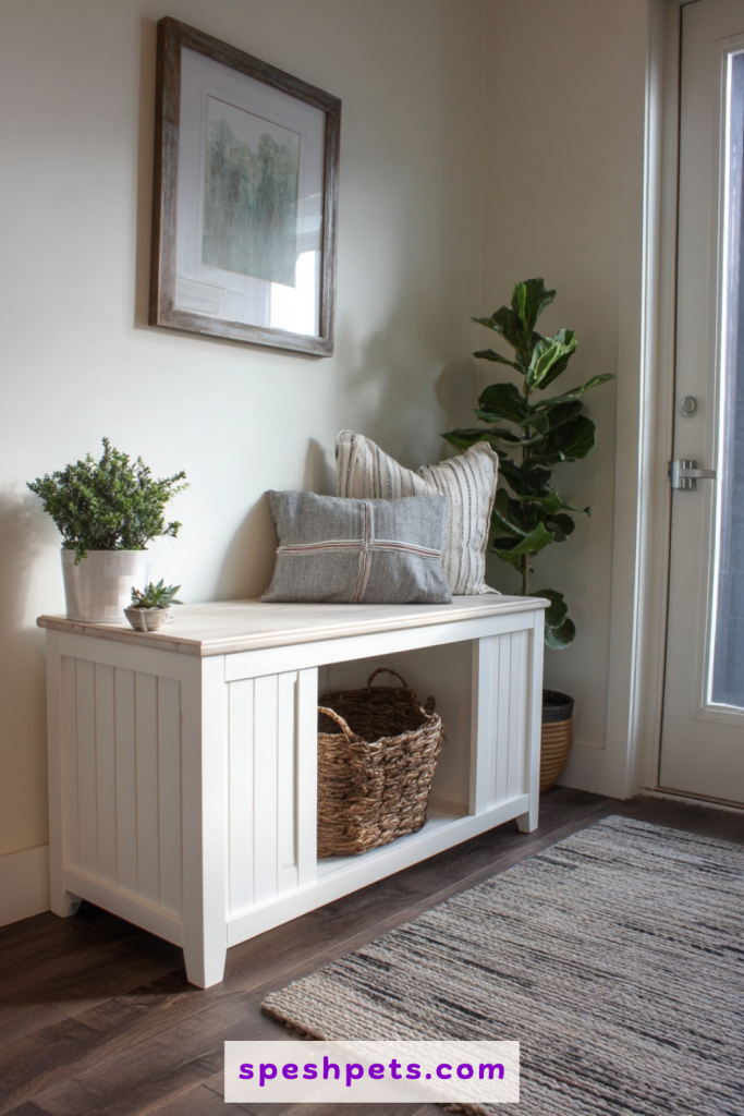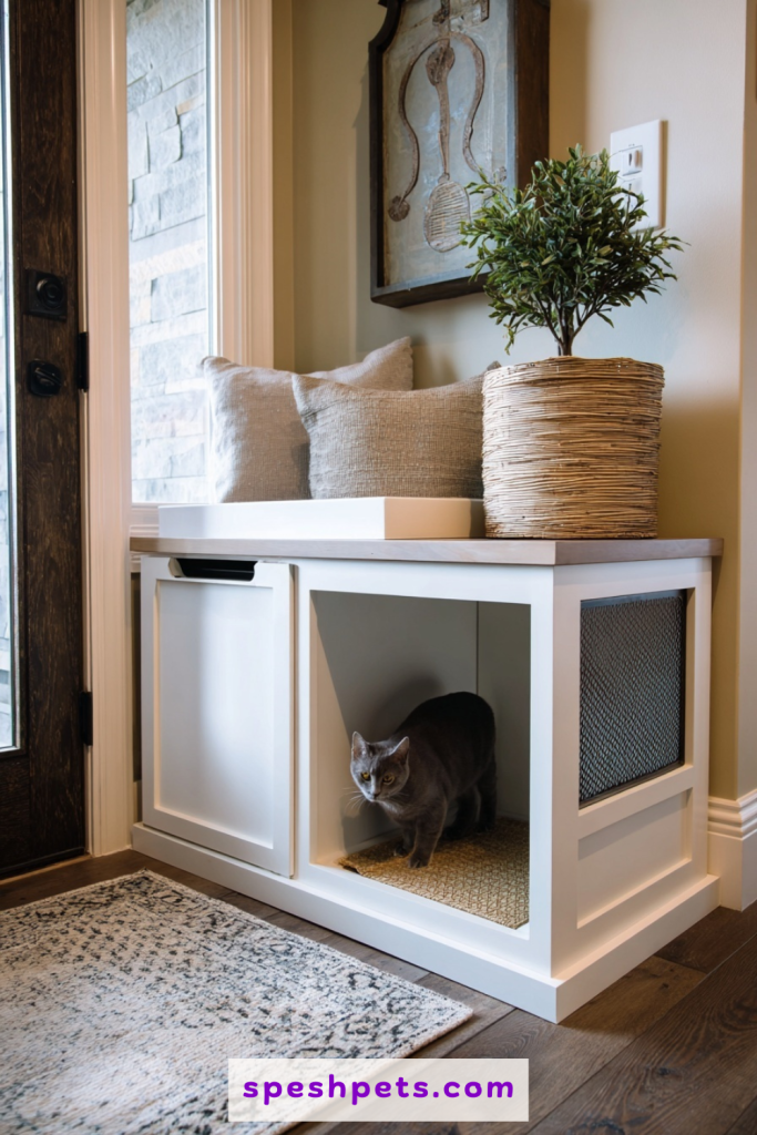 An entryway bench is often the first thing people see when they walk into a home, making it a clever place to hide a litter box while providing a spot to put on shoes. A hollow bench with a flip-top seat provides ample room for even the largest litter trays. Adding a small entrance on the side allows your cat to come and go without disturbing the primary function of the bench. This setup is particularly effective for trapping tracking litter before it reaches the rest of the house, as you can place a small textured mat inside the enclosure. It turns a utility area into a functional, welcoming part of your home foyer.