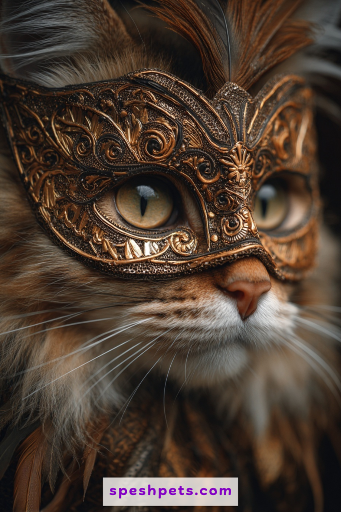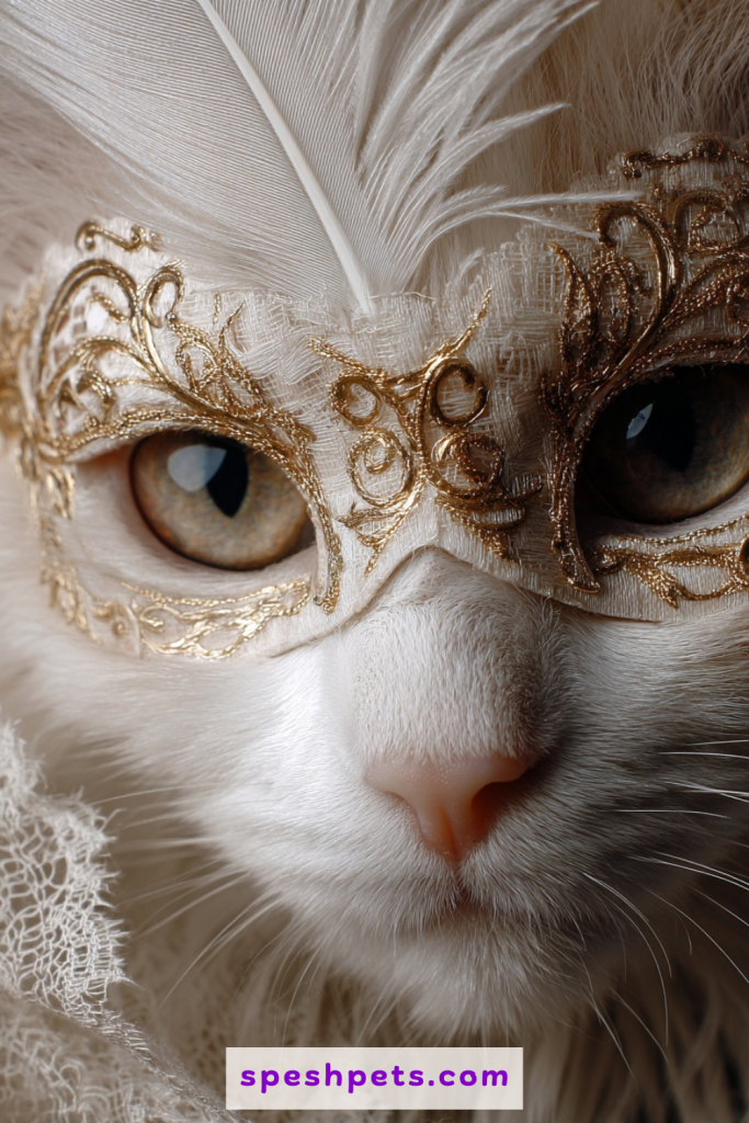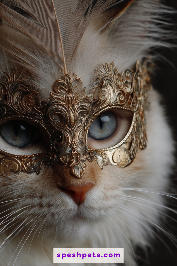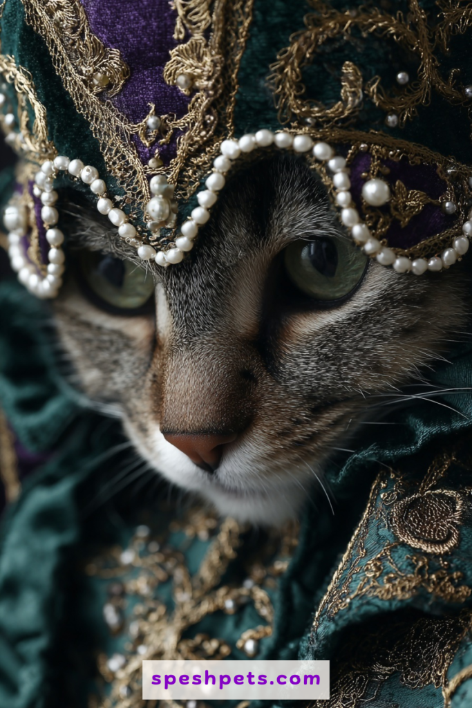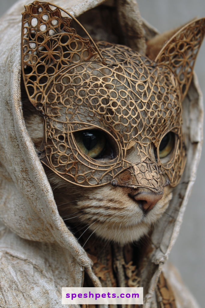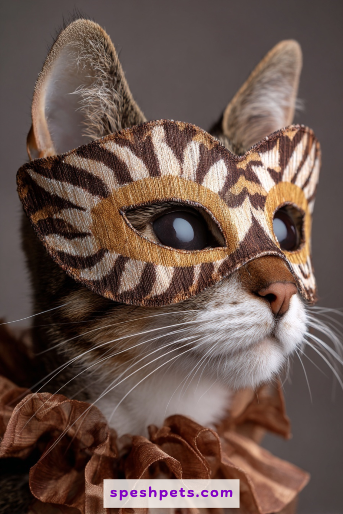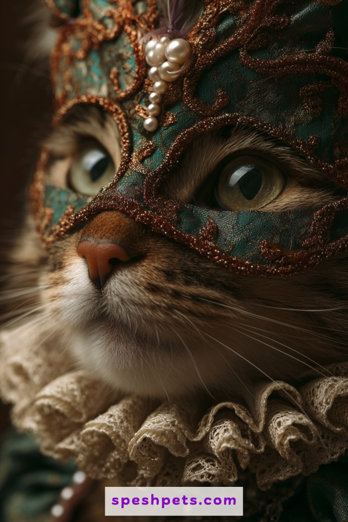 Drawing inspiration from the elaborate fashions of the Renaissance, this mask uses rich fabrics like velvet and brocade to create a look of historical elegance. Often featuring lace ruffs or pearl accents, it frames the cat’s face in a way that feels like a portrait from a museum. This style is best suited for calm, patient cats who don’t mind a slightly more structured accessory. The deep jewel tones of the fabric, such as emerald green or royal purple, contrast beautifully with almost any fur color. It is a sophisticated approach to pet styling that feels less like a costume and more like a piece of wearable art, perfect for those who appreciate history and fine detail.