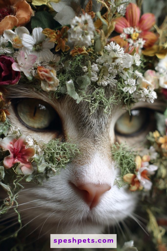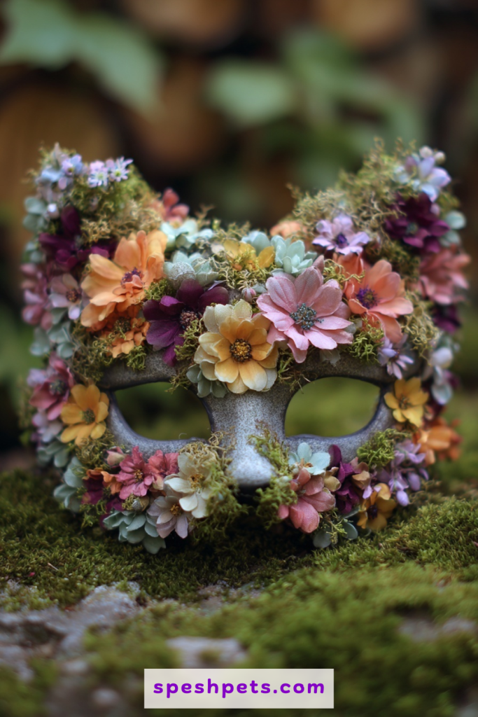 For a softer, more ethereal look, a mask constructed from miniature silk flowers and soft moss creates a stunning nature-inspired aesthetic. This whimsical design frames the face with tiny blossoms, making your cat look like a spirit of the forest or a guardian of the garden. You can customize the colors based on the season, bright pastels for spring or deep burgundies and oranges for the autumn months. Since cats are often intrigued by the scent of real plants, using high-quality silk alternatives ensures they won’t try to nibble on their new accessory. This style is particularly beautiful for outdoor photoshoots in dappled sunlight, highlighting the delicate textures of both the flowers and the cat’s fur.