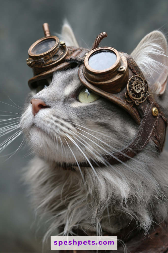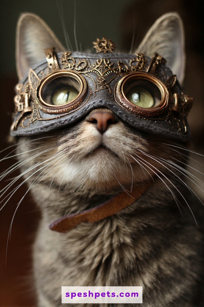 If your cat has a bit of an adventurous streak, a steampunk-inspired aviator mask with tiny, decorative goggles can look incredibly stylish. Incorporate elements like faux-leather textures, miniature brass gears, and metallic accents to give the mask a Victorian-industrial vibe. This look suggests a cat who spends their nights piloting a brass airship across a foggy skyline. To keep it safe, ensure the goggles are purely decorative and don’t actually cover the eyes, sitting instead on the forehead like a cool pair of shades. It is a highly detailed and visually interesting style that appeals to fans of science fiction and historical fantasy, making your pet the star of any creative project.