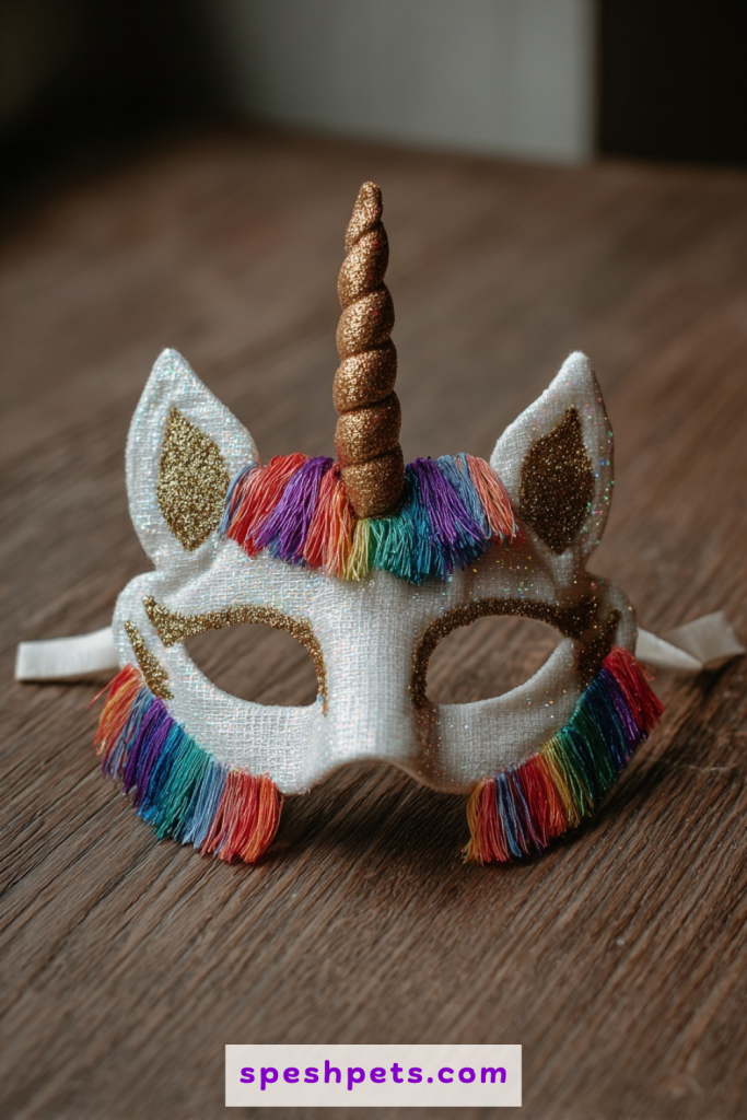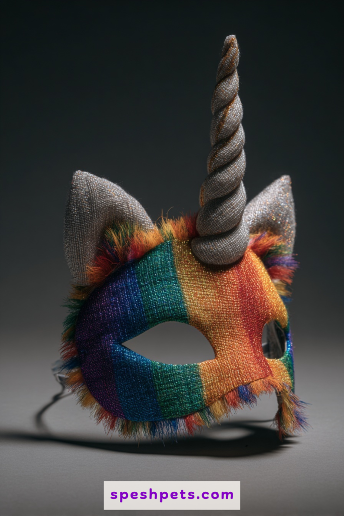 Tapping into the world of folklore, a unicorn-themed mask adds a touch of magic to your pet’s wardrobe. This design typically features a central, spiraled horn made of shimmering fabric, flanked by small, colorful ears and a fringe of rainbow-colored yarn or fur. It creates a silhouette that is instantly recognizable and undeniably cute, especially on cats with a playful or chaotic personality. The soft construction of a fabric mask allows for plenty of movement, so your cat can still jump and play while looking like a legendary creature. It is a wonderful way to inject some color and fantasy into your pet photography, proving that even the grumpiest cat can have a mythical side.