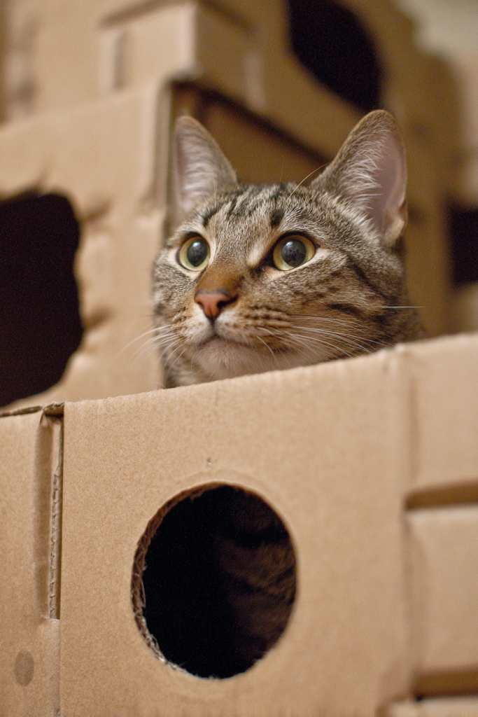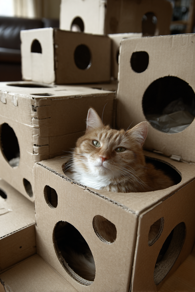 There is an unwritten rule in the feline universe that if a cardboard box exists, a cat must immediately attempt to occupy it, regardless of the box’s actual size. You can take this obsession to the next level by stacking various boxes together to create a multi-level fortress, complete with peepholes and hidden passages. Cutting circular holes in the sides allows your cat to reach out and bat at passing toys while remaining safely hidden within their cardboard walls. They will spend hours exploring the different levels, jumping from the floor to the roof of their new castle with a sense of ownership and joy. It is a fantastic way to recycle your shipping materials while providing your cat with a complex vertical space that makes them feel like the king or queen of their domain.