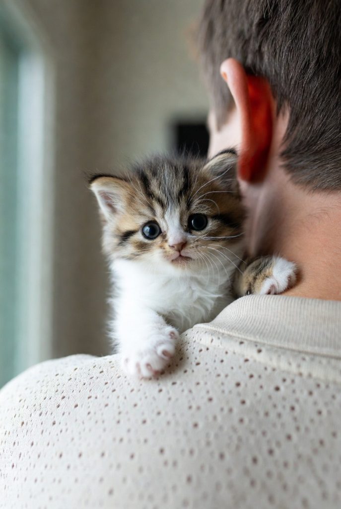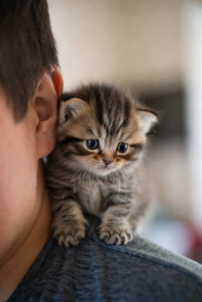 Some kittens decide very early on that the floor is for commoners and the best view of the world is from a human shoulder. They will climb up your jeans and sweater with surprising speed, perching right next to your ear like a fuzzy parrot. This behavior is incredibly sweet when they weigh only a few ounces, and it shows their desire to be part of everything you do. They want to see what you are cooking, what you are reading, and most importantly, what you might be eating.