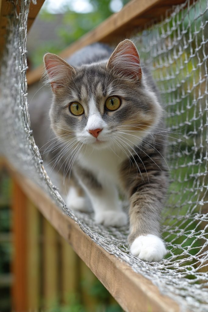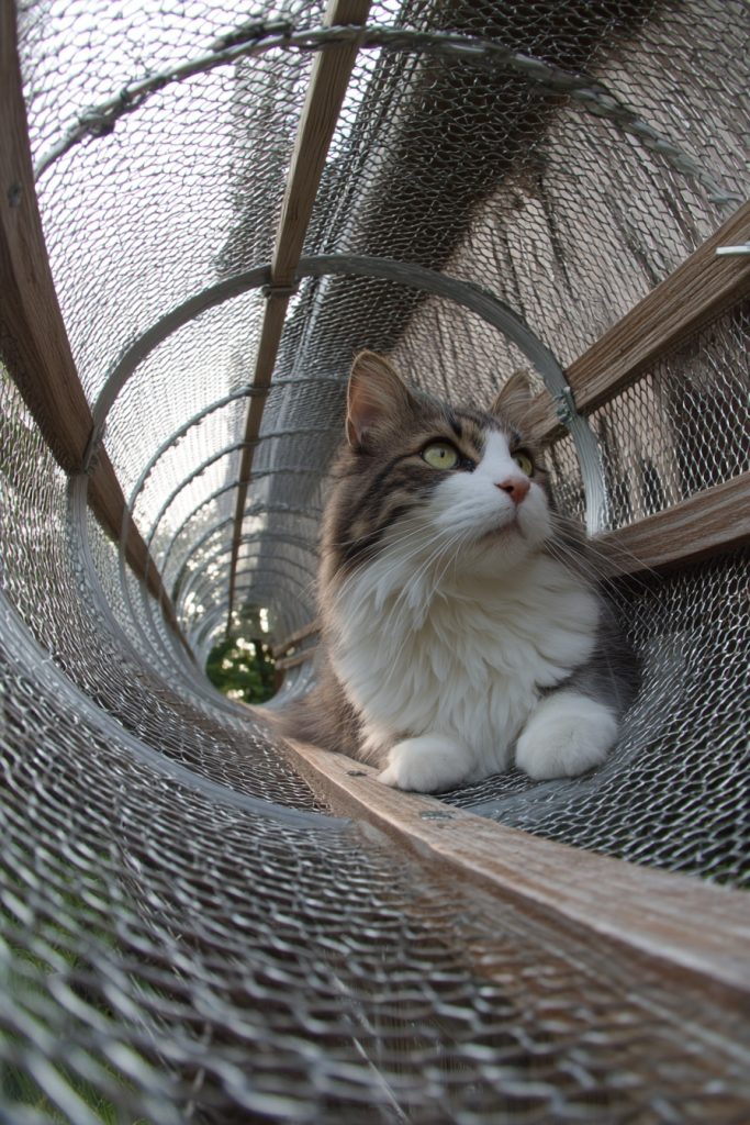 If you have a cat that loves to roam and survey their kingdom from above, an elevated skyway tunnel system is a game-changer for your backyard. These tunnels are typically made of wire mesh or wood and are installed along the sides of your home or fence line, connecting different parts of the yard. This allows your cat to travel from the house to a far-off lounging platform or even around the entire perimeter of the garden while remaining completely enclosed. It offers a dynamic form of exercise as they climb and navigate the different levels and turns of the system. This setup is particularly impressive because it utilizes vertical space that would otherwise go unused, providing a thrilling obstacle course that keeps your cat mentally sharp and physically active throughout the day.