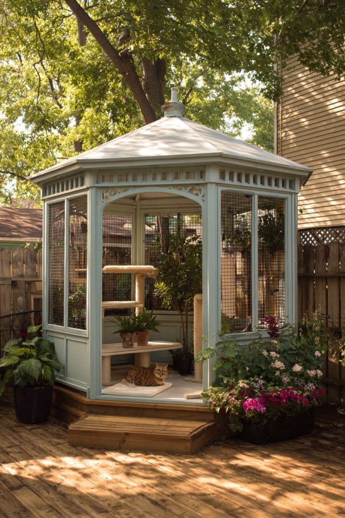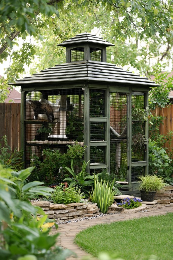 A freestanding garden oasis is a standalone structure that sits in the middle of your yard, often designed to look like a miniature gazebo or a decorative greenhouse. Unlike attached enclosures, this type of catio allows your pet to be fully immersed in the garden environment, surrounded by plants and the sounds of nature on all sides. You can fill the interior with cat-safe vegetation, scratching posts, and multiple lounging levels to create a true sanctuary for your pet. It is a wonderful option for owners who have a larger yard and want to create a focal point that is both functional for the cat and aesthetically pleasing for the humans. By placing it near a bird feeder or a butterfly garden, you provide endless entertainment for your curious feline.