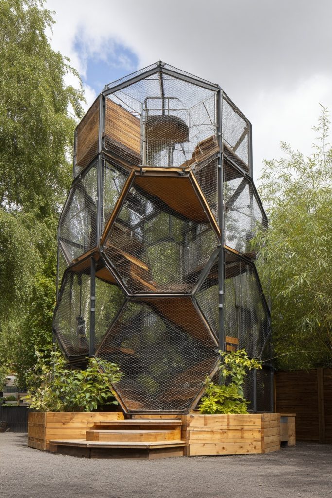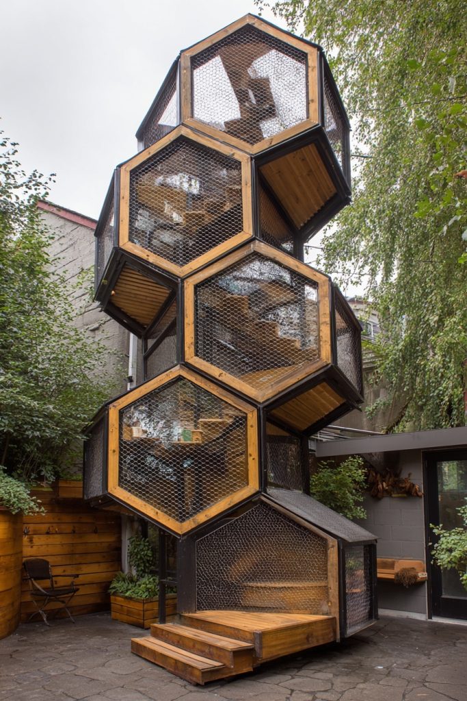 The modular hexagonal tower is a stylish and space-efficient enclosure that focuses on vertical height rather than a large horizontal footprint. These towers are often made of stackable wooden or metal frames with mesh sides, allowing you to add more levels as needed. They provide a series of platforms and ladders that mimic the experience of climbing a tree, which is a natural and healthy activity for any cat. Because of its geometric shape, it adds a modern and architectural touch to your backyard or patio. This design is particularly well-suited for multiple-cat households, as it provides several different levels where each cat can find their own private spot to nap or observe the surroundings without feeling crowded by their housemates.