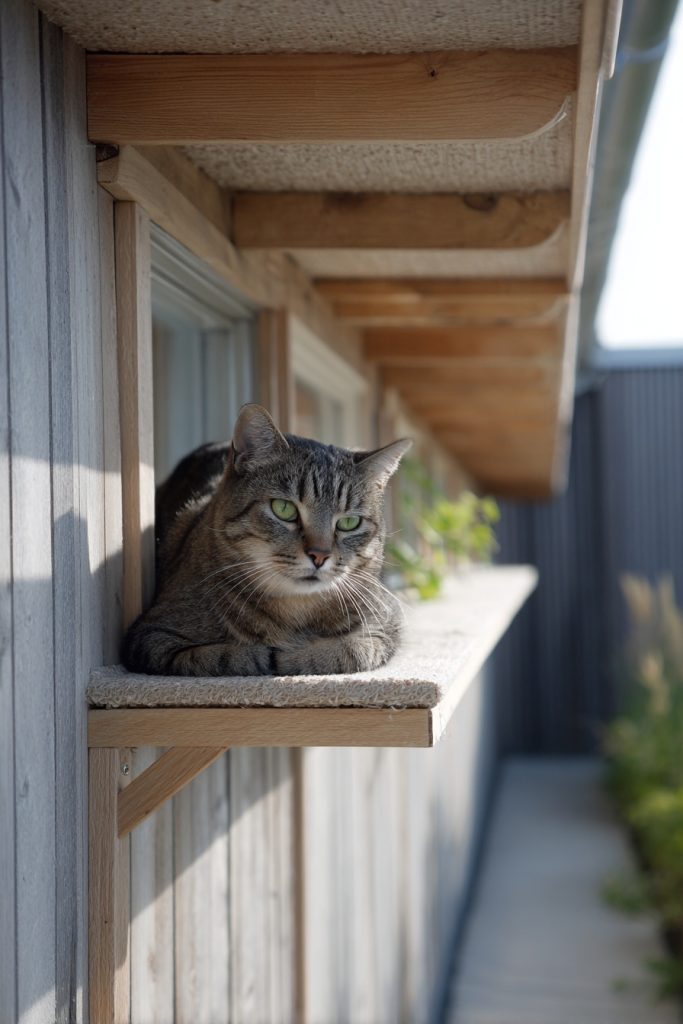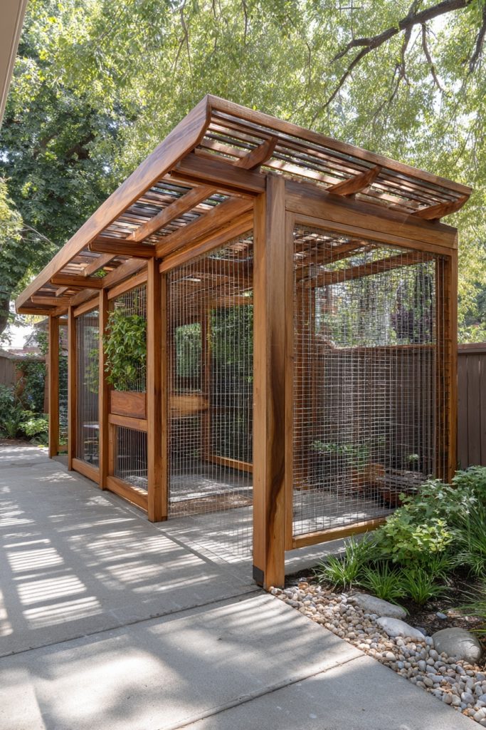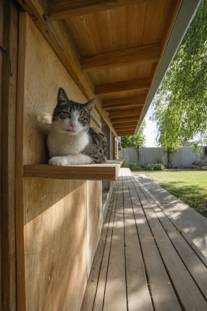 An under-eave cat run is a clever way to use the often-wasted space beneath the overhang of your roof to create a long, narrow enclosure. This design is perfect for homes with limited yard space, as it stays close to the walls of the house and doesn’t encroach on the main lawn area. It provides a sheltered pathway where your cat can walk and lounge, protected from the rain and direct midday sun by the roof itself. You can install several wall-mounted shelves and scratching pads along the run to keep the environment interesting and tactile. It is a subtle and efficient way to provide outdoor access, making it an ideal choice for owners who want a low-profile solution that is highly functional for their pet’s daily routine.