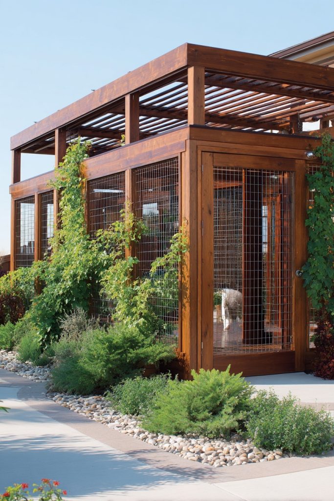 For the design-conscious homeowner, a pergola-style catio offers a sophisticated look that blends perfectly with high-end outdoor living spaces. This enclosure features a sturdy wooden frame with a slatted roof that provides partial shade and a beautiful play of light and shadow throughout the day. The sides are enclosed with high-quality wire or glass panels, keeping the cat secure while maintaining a sense of openness and luxury. You can even train climbing plants like jasmine or honeysuckle to grow over the top, providing natural shade and a pleasant scent for both you and your cat. It is a beautiful way to integrate your pet’s needs into your overall landscape design, ensuring that their safe space looks like a deliberate and elegant part of the home.