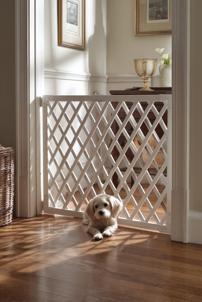 A garden lattice panel is an often-overlooked material that makes for an excellent pet gate because it is pre-constructed and allows for maximum airflow and visibility. By framing a section of vinyl or wood lattice, you create a barrier that feels much less restrictive than a solid wall, which can help your dog feel less isolated from the family action. This is particularly beneficial for dogs that tend to whine or bark when they cannot see exactly what you are doing in the next room. The crisscross pattern is also perfect for hanging small signs or even a clip for a leash, adding a bit of organizational utility to the project. It provides a classic, airy look that works beautifully in traditional or country-style homes, making the boundary feel like a natural extension of the room.