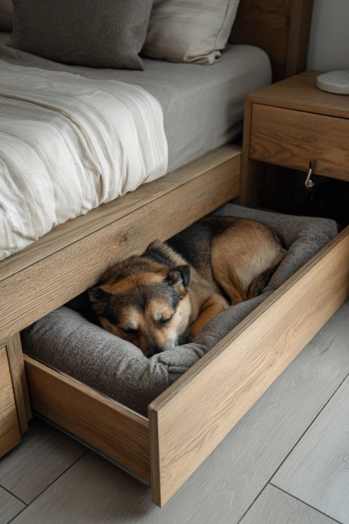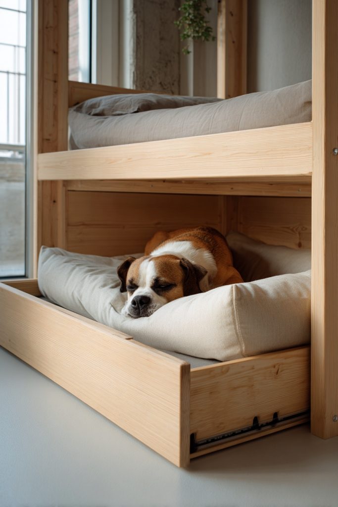 The integrated pull-out drawer is a masterclass in space-saving design for those who want to keep their floor clear during the daylight hours. This concept features a sturdy platform bed with a deep, smooth-gliding drawer located at the base or the side of the frame. Inside, a plush cushion is fitted perfectly to provide your dog with a comfortable and secluded sleeping area that can be tucked away when guests are over or when you need more room to move. It is an ideal solution for smaller coliving apartments where every inch of floor space is at a premium and a traditional pet bed might feel like clutter. During the night, the drawer remains open, offering a low-profile and secure spot for your companion to rest while remaining right at your side. This design ensures that your home remains tidy and organized while still catering to the essential comfort of your pet.
