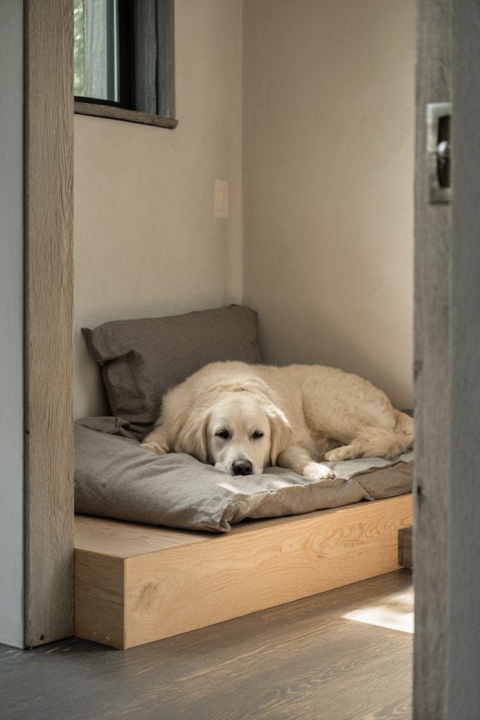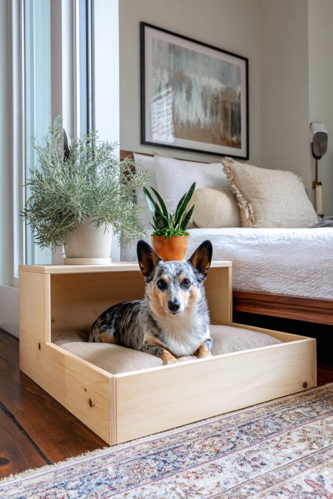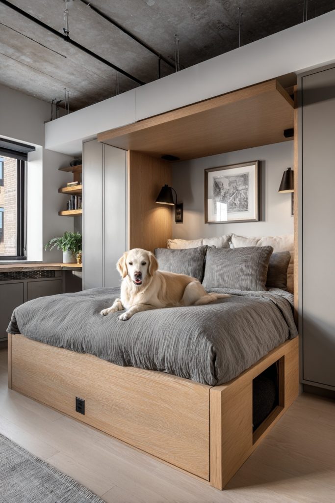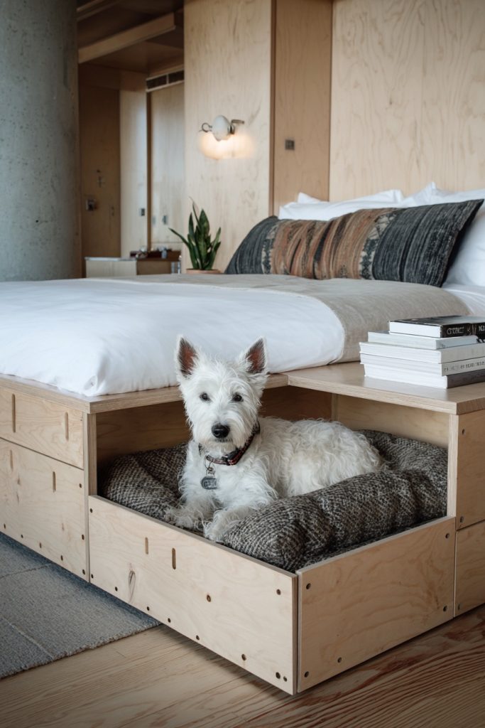 Utilizing the corner of a room is a brilliant way to create a secure and out-of-the-way sleeping zone, and a corner alcove platform bed does exactly that. By extending the platform slightly beyond the mattress on one or two sides, you create a flat surface that can be used for a pet bed or even a small side table. The area directly beneath this extension becomes a protected nook where your dog can curl up and feel completely safe, as they are surrounded by walls on two sides. This configuration is excellent for helping a dog feel secure in a shared living environment where there might be more noise or movement than they are used to. It makes efficient use of corner space, which is often difficult to furnish effectively, and provides a clear boundary between your sleeping area and your pet’s dedicated spot.