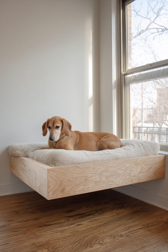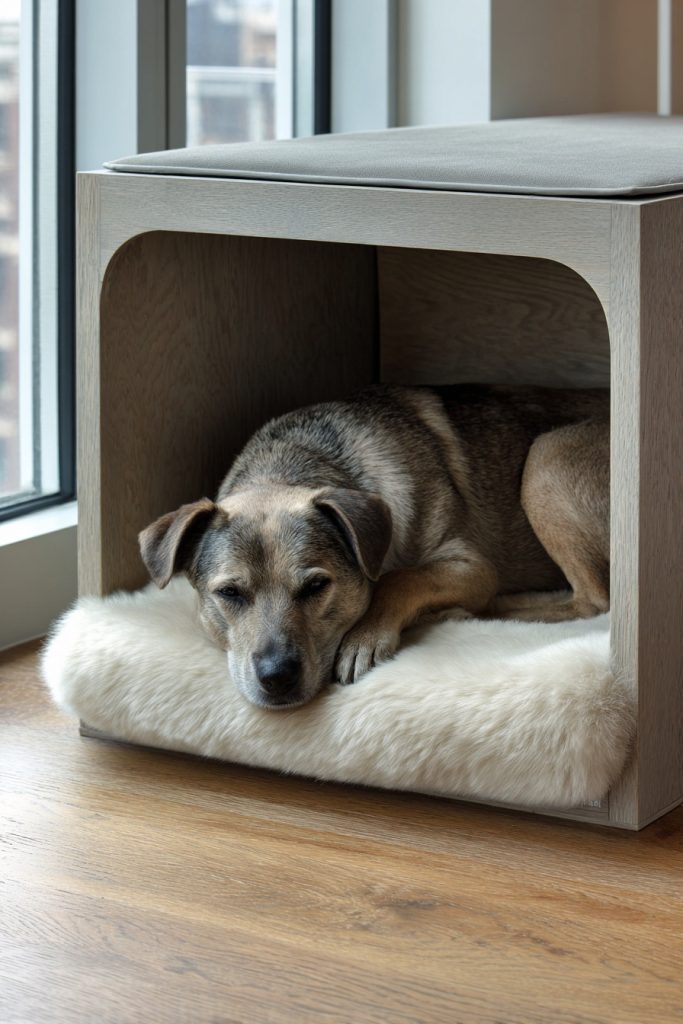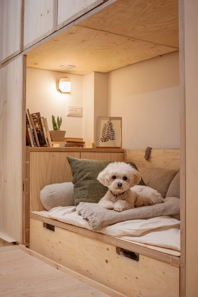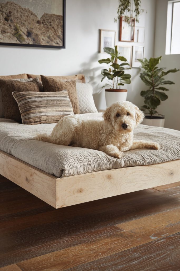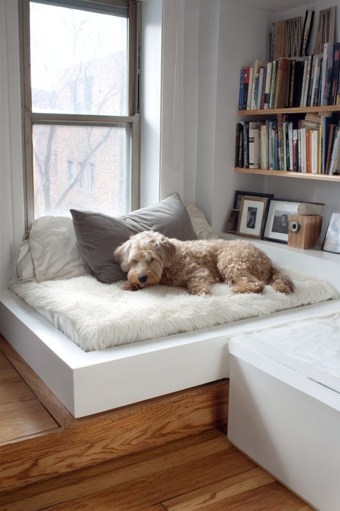 Utilizing the corner of a room is a brilliant way to create a secure and out-of-the-way sleeping zone, and a corner alcove platform bed does exactly that. By extending the platform slightly beyond the mattress on one or two sides, you create a flat surface that can be used for a pet bed or even a small side table. The area directly beneath this extension becomes a protected nook where your dog can curl up and feel completely safe, as they are surrounded by walls on two sides. This configuration is excellent for helping a dog feel secure in a shared living environment where there might be more noise or movement than they are used to. It makes efficient use of corner space, which is often difficult to furnish effectively, and provides a clear boundary between your sleeping area and your pet’s dedicated spot.