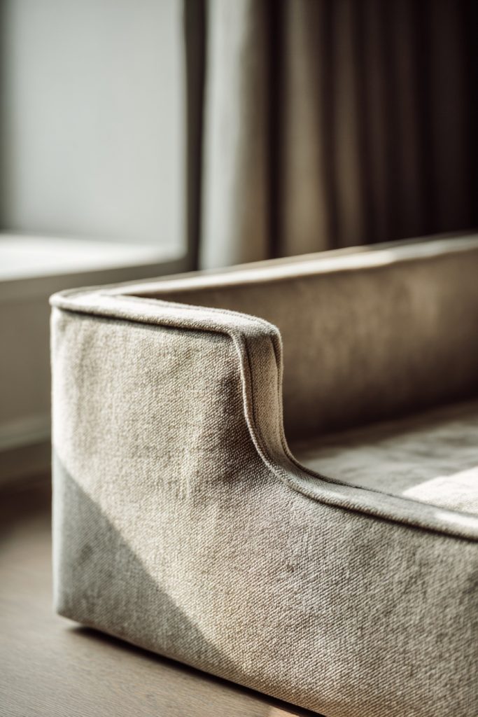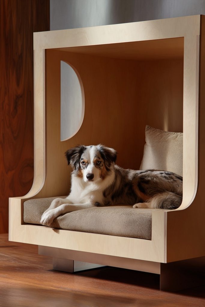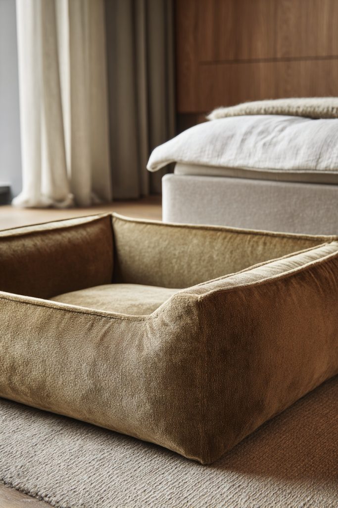 Adding a touch of luxury to your coliving space, an upholstered bed base with a built-in cutout provides a soft and tactile environment for both you and your dog. The base is wrapped in durable fabric, such as velvet or linen, and features a neatly finished opening that leads to a padded interior. This design eliminates hard edges and corners, making it a safer and more comfortable option for pets that like to lean against their surroundings while they sleep. The fabric can be chosen to match your bedding or curtains, creating a cohesive and well-thought-out interior design. This style of bed feels incredibly cozy and inviting, turning the sleeping area into a plush focal point of the room. It is a sophisticated way to integrate pet care into your lifestyle, proving that pet-friendly furniture can be just as elegant and high-fashion as any other piece in your home.