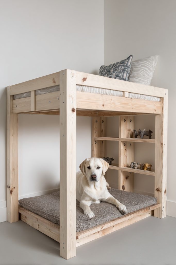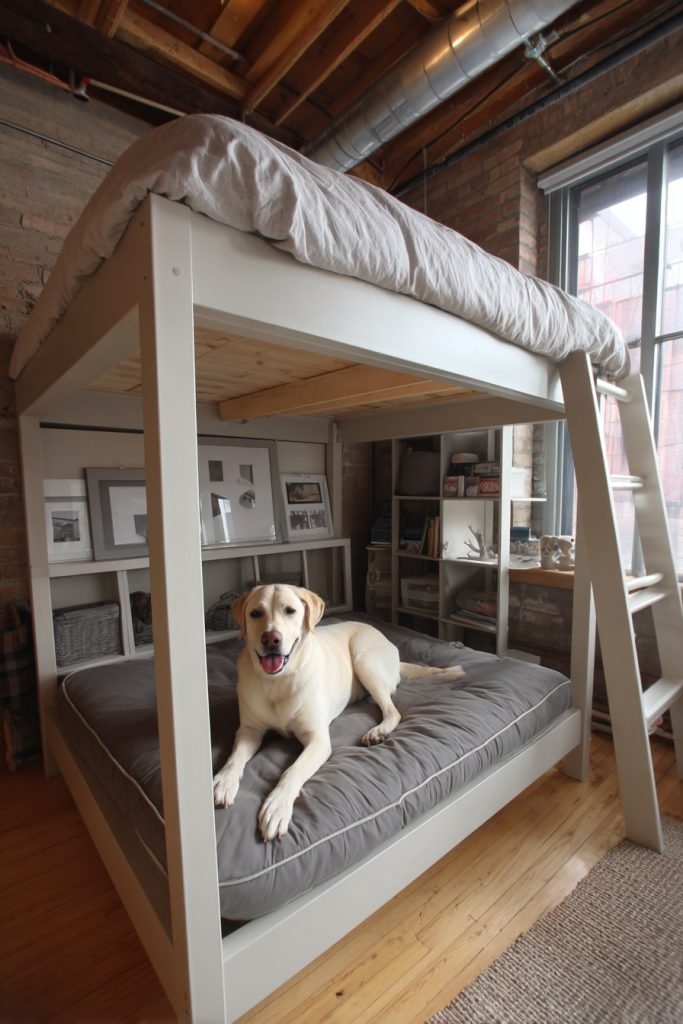 An elevated loft bed is a classic choice for maximizing vertical space, and it provides the perfect opportunity to create a spacious lounge area for your dog underneath. By lifting the human sleeping area slightly higher, you create an expansive and airy zone below that can be outfitted with a high-quality pet mattress and even small shelves for toys or accessories. This design is particularly beneficial for larger dogs that might feel cramped in a smaller cubby or drawer system. The open nature of the loft allows for excellent airflow and visibility, ensuring that your pet feels part of the action while still having a clearly defined territory. It transforms the footprint of a single piece of furniture into a multi-story living solution that respects the needs of both the owner and the pet, making it a favorite for those living in compact studio apartments or shared houses.