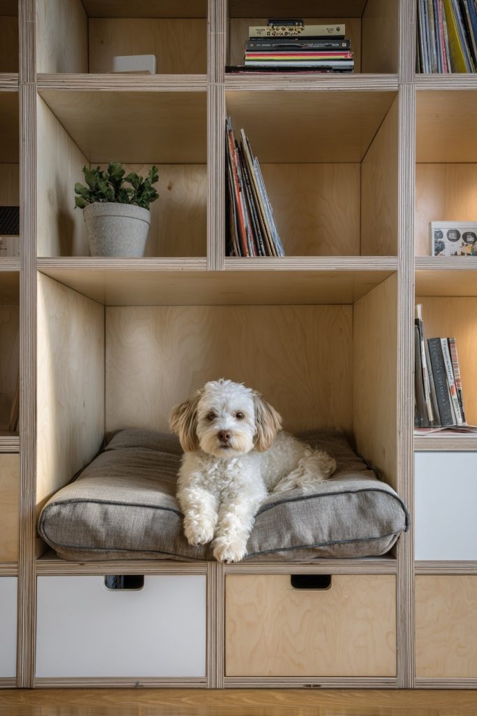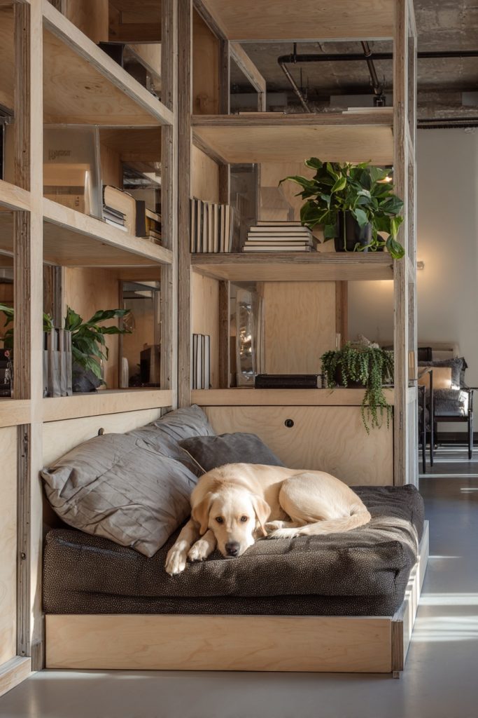In a coliving situation, storage is often just as important as sleeping space, and a modular cube frame allows you to satisfy both needs while accommodating your dog. By using a series of sturdy storage cubes as the foundation for your mattress, you can leave one or two segments open and padded to serve as a cozy pet hideaway. This modular approach is highly customizable, allowing you to choose exactly where your pet’s bed is located based on the layout of your room and your dog’s preferences. The remaining cubes can be used for books, clothes, or shared household items, keeping your personal space organized and functional. It is a smart and budget-friendly way to create a personalized environment that adapts to your changing needs. The visual repetition of the cubes creates a modern and clean look that helps to unify the room and reduce visual clutter.