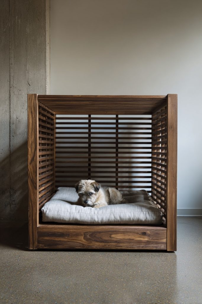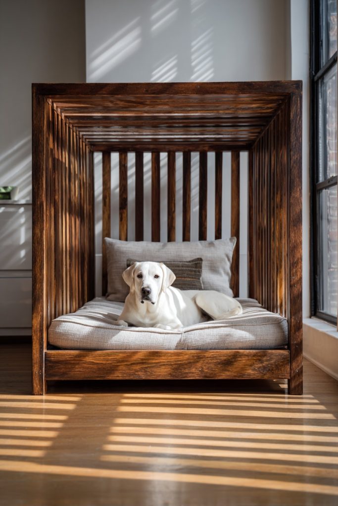 The slatted shadow box bed frame offers a unique blend of privacy and ventilation for your pet, utilizing a series of wooden slats to create a semi-enclosed space beneath the mattress. This design allows light and air to filter through, preventing the pet area from feeling too dark or stuffy, which is essential for a dog’s comfort. The slats provide a sense of visual interest and texture to the room, making the bed frame look like a piece of custom carpentry. Inside the shadow box, a durable and washable pet bed can be placed, providing a soft landing spot that is protected from the foot traffic of a busy shared home. This style works exceptionally well in minimalist or rustic interiors, where the natural beauty of wood grain can take center stage. It provides your pet with a quiet retreat that feels tucked away from the world without being completely disconnected from your presence.
