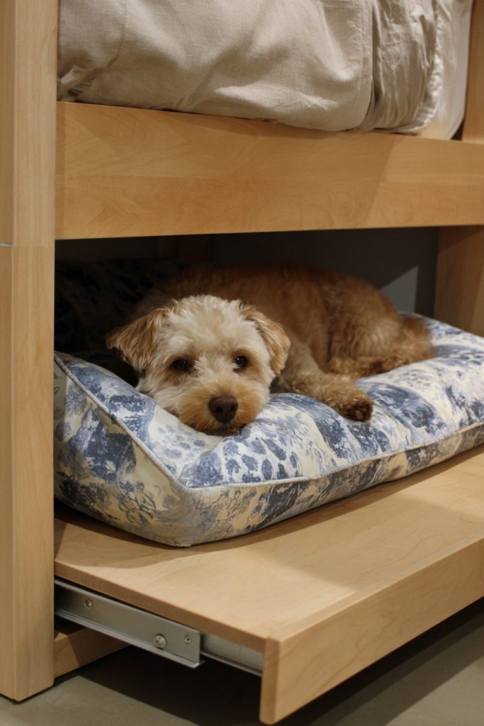 Similar to a guest trundle, a hidden trundle slide for a pet bed is a functional and discreet option that is perfect for maintaining a high level of organization. The trundle is a shallow platform on wheels that sits completely out of sight beneath the main bed frame during the day. When it is time for rest, you simply slide it out to reveal a fully equipped and comfortable pet bed. This design is particularly useful for owners of small to medium-sized dogs who want to maintain a minimalist look in their bedroom. It ensures that the pet bed is always in the same place and provides a stable and consistent sleeping environment for your companion. In a coliving home, where multiple people may be sharing a limited amount of space, the ability to hide pet accessories when they are not in use is a major benefit for everyone’s comfort.