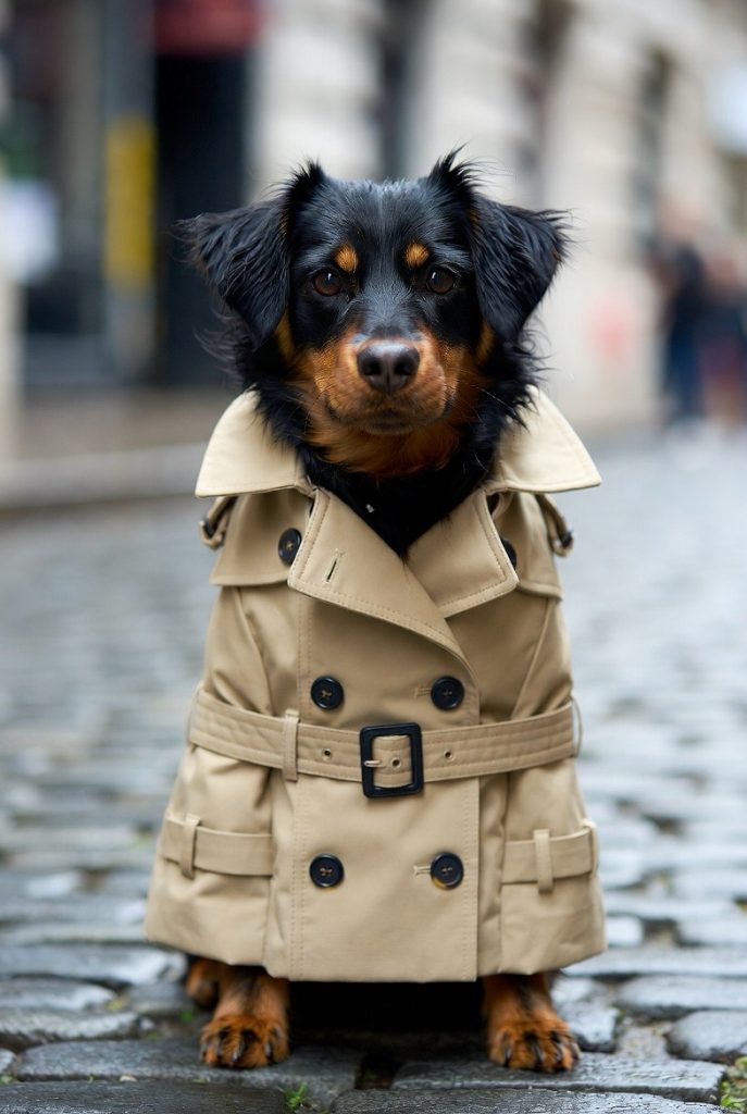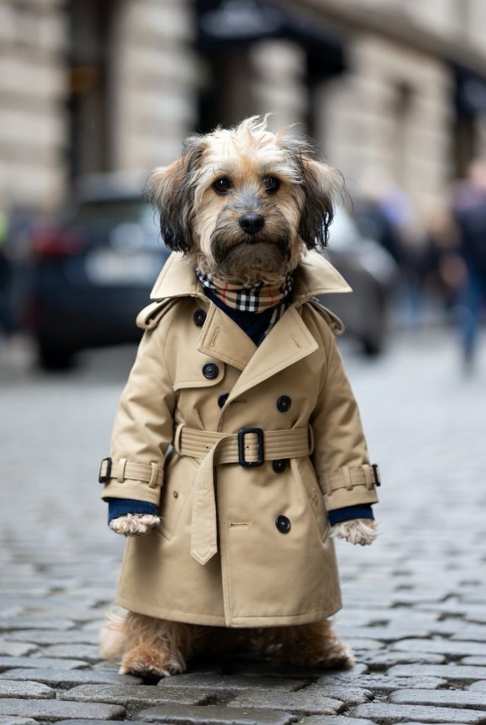 Inspired by the iconic Burberry aesthetic, a miniature trench coat is the height of canine luxury. This look is perfect for rainy days in the city where style cannot be sacrificed for weather protection. Look for a coat with a classic double-breasted button front and a belted waist to give your dog a sleek, tailored silhouette. A tan or camel color is most traditional, but navy also offers a very polished alternative. This is a high-impact piece for a photoshoot, especially when paired with a backdrop of cobblestone streets or city architecture.