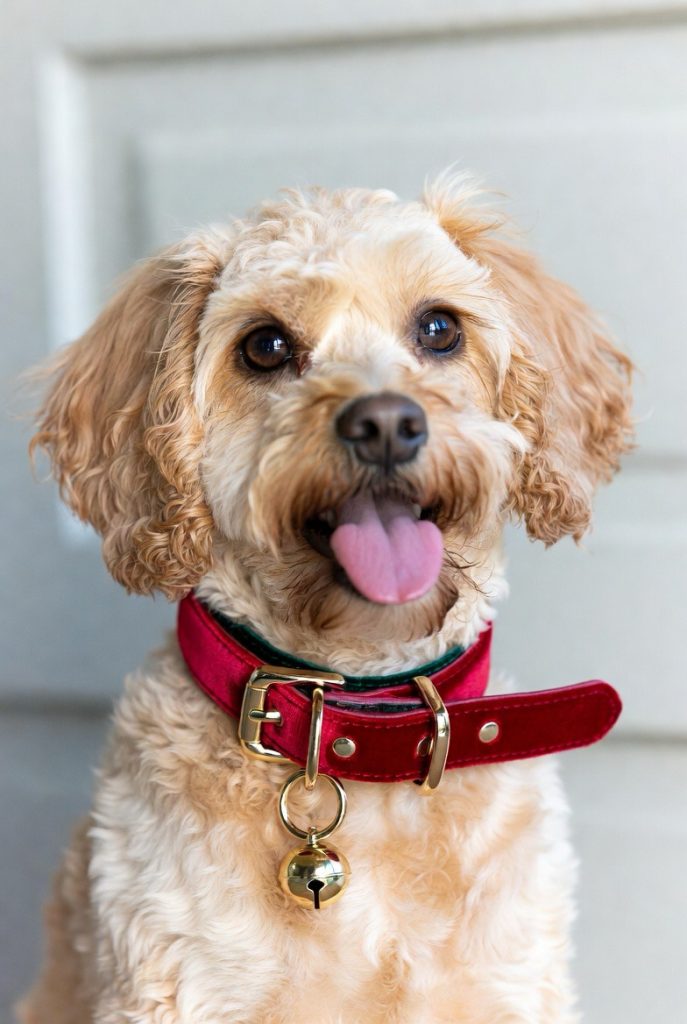 For the winter season, elegance is all about texture, and nothing beats the lush feel of velvet. A deep emerald or ruby red velvet collar, often accented with a gold buckle or a small bell, turns any dog into a holiday icon. This look is about understated luxury; it doesn’t need much else to make a statement. It is the perfect choice for family holiday cards or a “fancy” dinner party at home. The way the velvet catches the light adds a rich, professional quality to photos that standard nylon or leather collars simply cannot achieve.