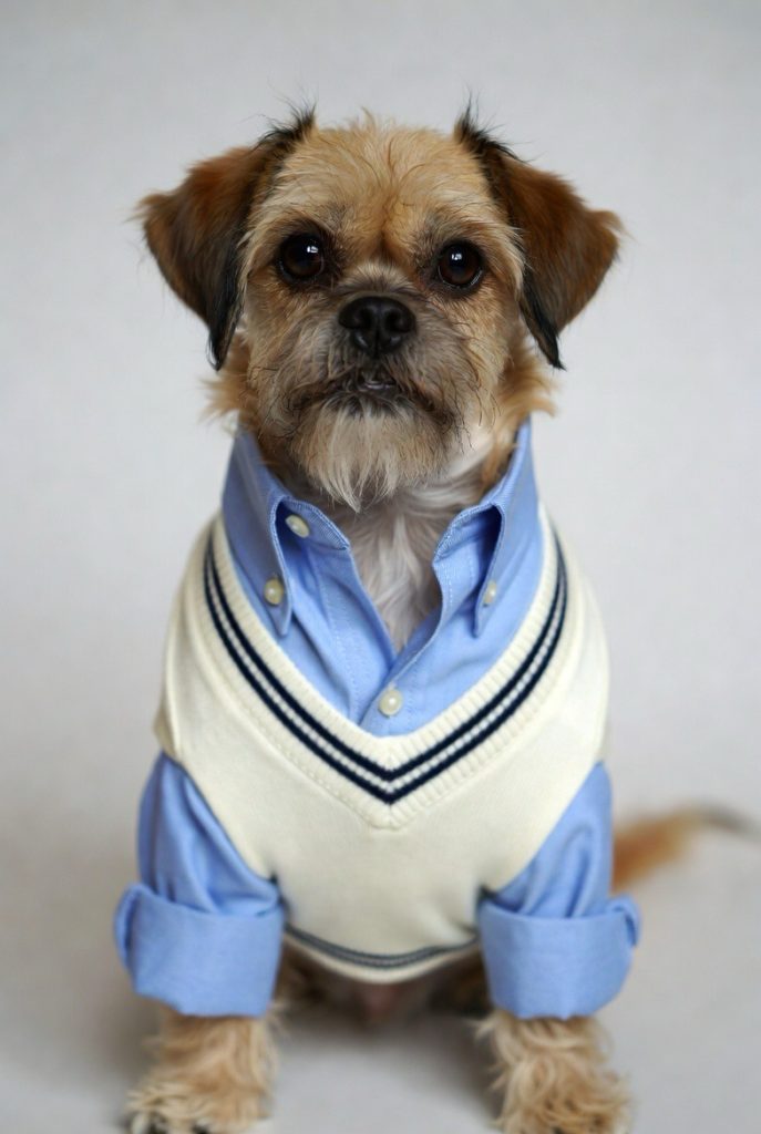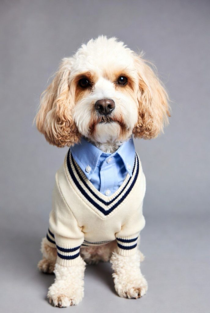 If you really want to go all out with the preppy aesthetic, the layered look is the gold standard. This involves a small button-down Oxford shirt (usually in white or light blue) worn underneath a V-neck sweater. The trick is to let the collar of the shirt peek out over the top of the sweater. It is the pinnacle of “human-style” dog fashion and never fails to get a reaction. While it requires a bit more patience from the dog during the dressing process, the result is an incredibly charming and “gentlemanly” look that is perfect for a high-end pet portrait.
