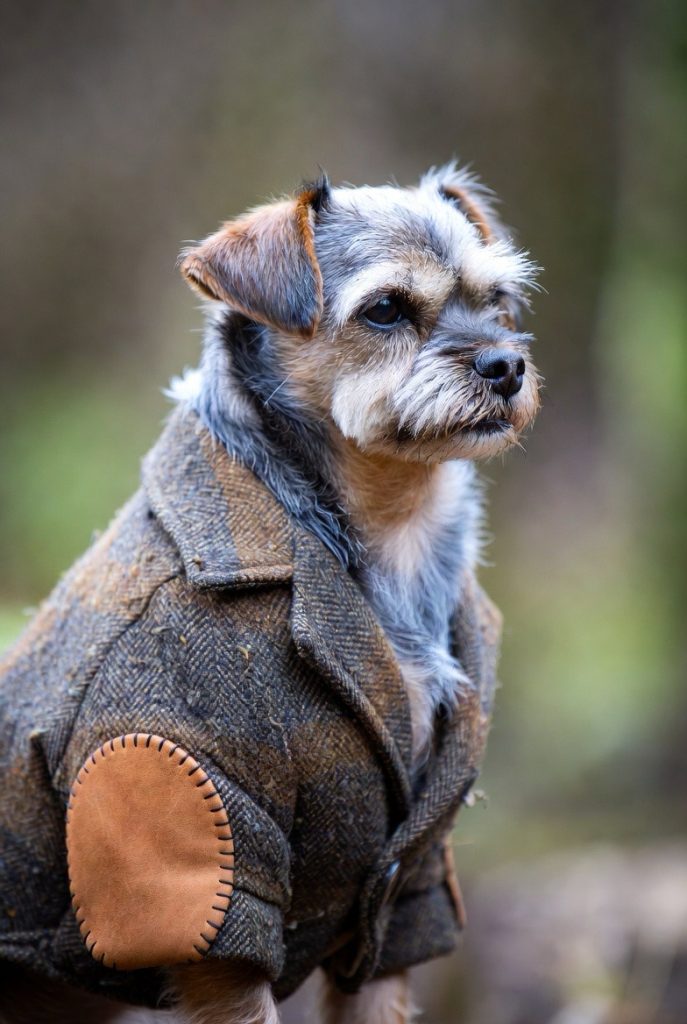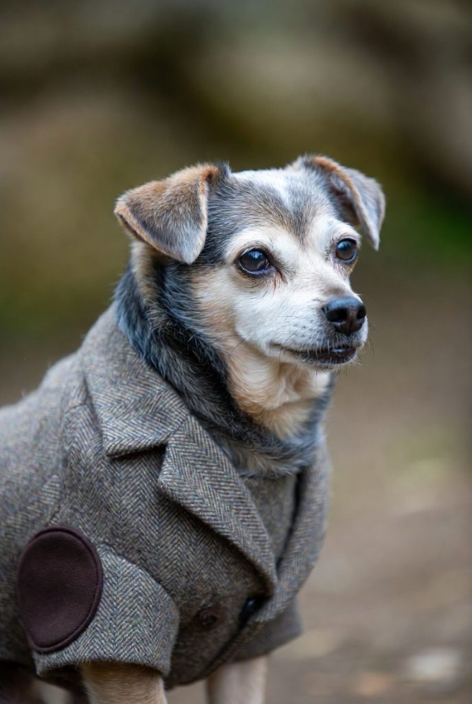 Tweed is synonymous with the British countryside and a sophisticated, scholarly lifestyle. A small tweed jacket or blazer, complete with faux-leather elbow patches, is the ultimate way to make your dog look like a distinguished gentleman. The heavy, woven fabric provides a wonderful visual depth in photographs. This is a great choice for older dogs who have a naturally calm and wise demeanor, as the “professor” look fits their personality perfectly. Stick to earth tones like grey, moss, and brown to keep the aesthetic grounded and authentic.