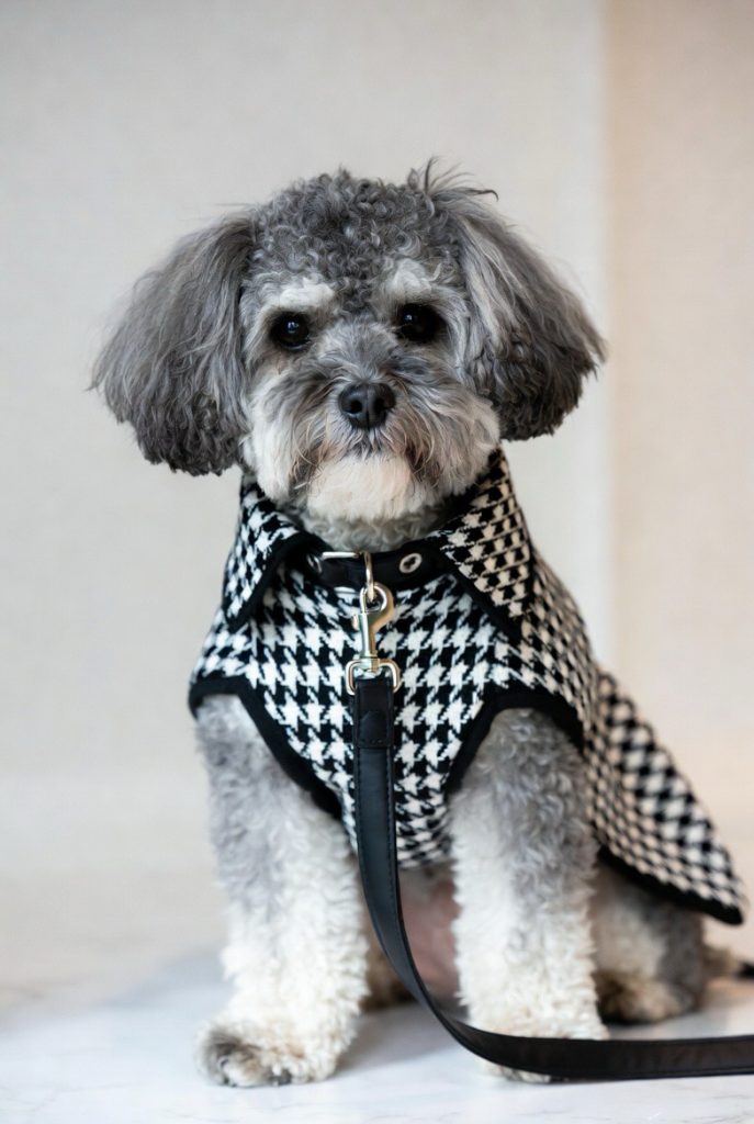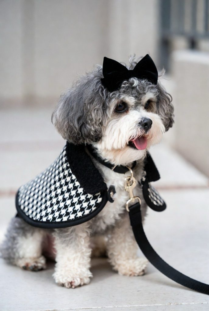 Houndstooth is a bold, graphic pattern that has remained a staple of high fashion for decades. A small cape or coat in a black and white houndstooth print is a daring but very preppy choice. Because the pattern is so busy, it is best to keep the rest of the accessories minimal. A simple black lead is all you need. This look is incredibly photogenic because the high-contrast pattern draws the eye immediately. It gives your dog an air of “city chic” sophistication that looks like it belongs on the cover of a pet-focused fashion magazine.