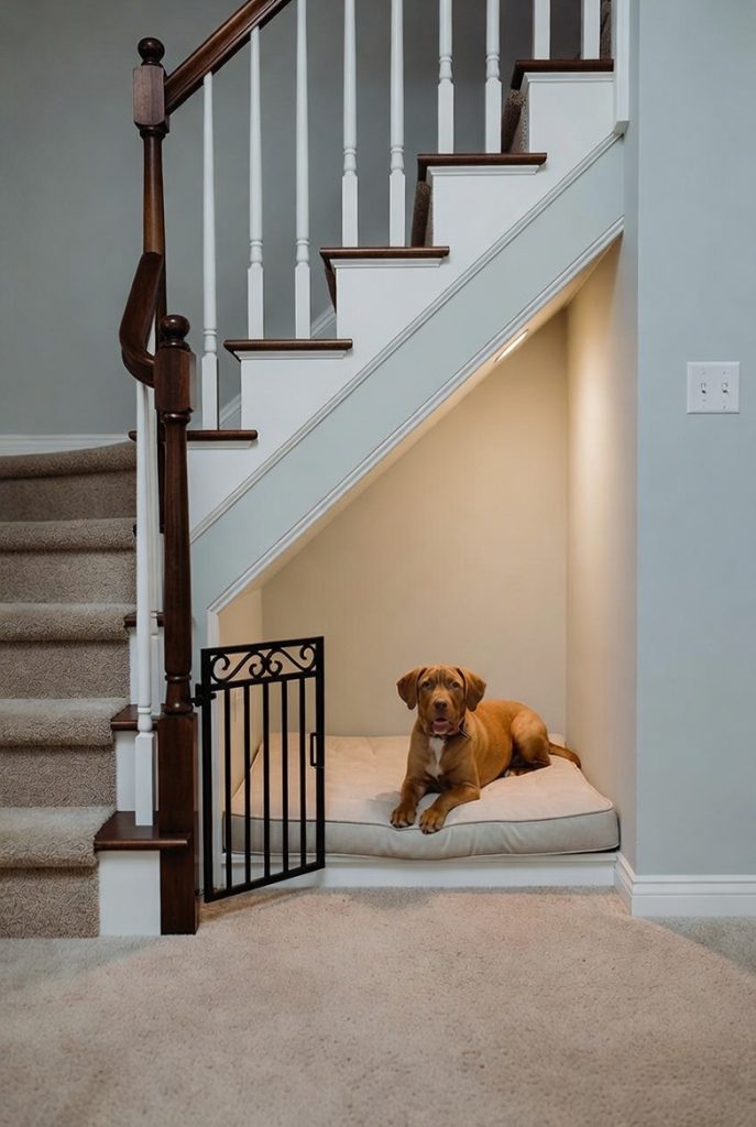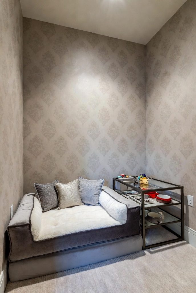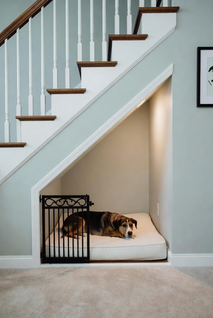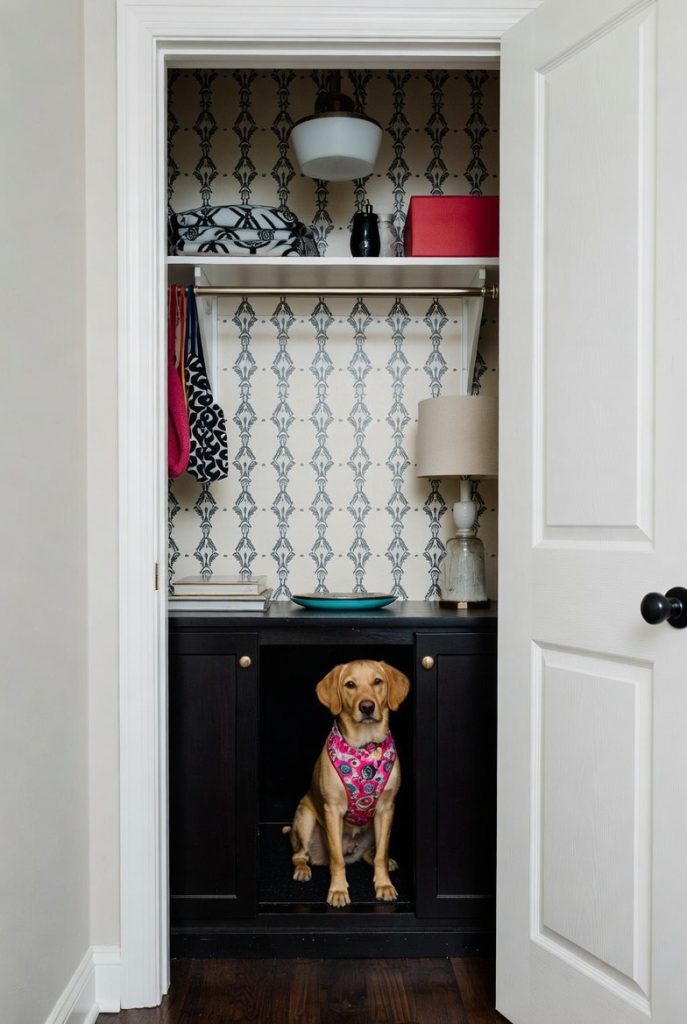 If you have a hallway closet that is mostly filled with things you don’t use, consider removing the door and turning the bottom half into a designer dog den. By adding some chic wallpaper to the interior and a stylish light fixture, you can turn a dark storage space into a vibrant and cozy focal point. The top shelves can remain for your own storage, while the bottom becomes a private getaway for your dog. This is an especially good idea for anxious dogs who need a very quiet, enclosed space to retreat to when the house gets too loud or busy.