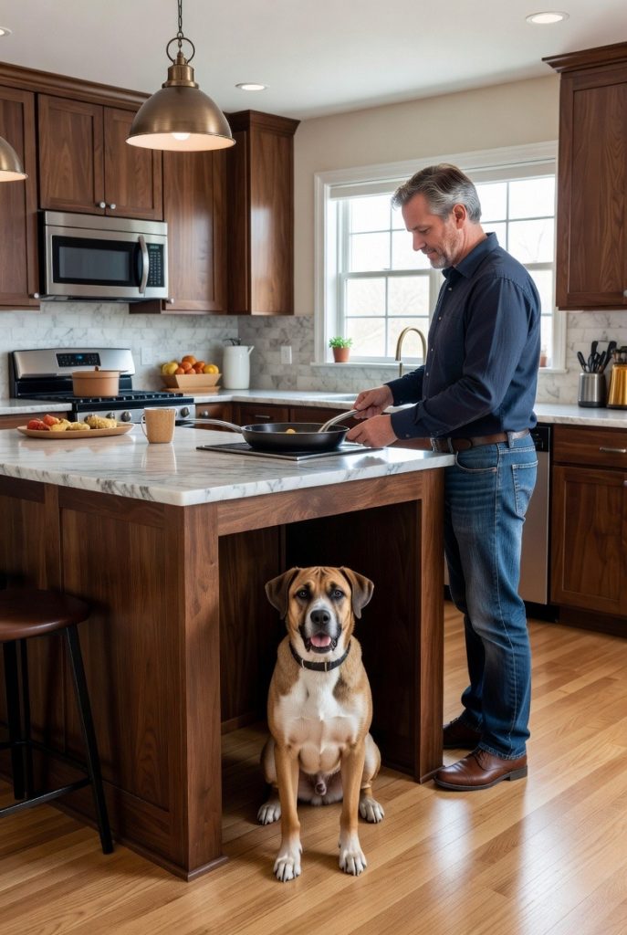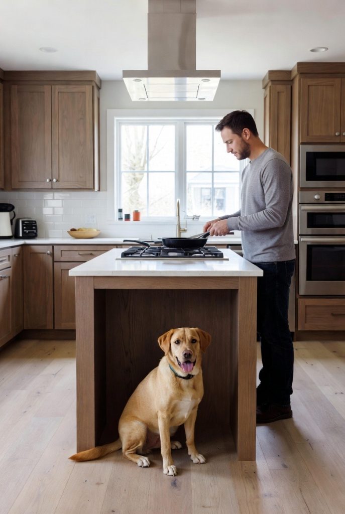 The kitchen is the heart of the home, and most dogs love to be right where the delicious smells are. By designing a built-in nook at the end of your kitchen island, you give your pup a front-row seat to the culinary action without them being underfoot while you are handling hot pans. This design allows you to use the same cabinetry and countertop materials as the rest of your kitchen, making the dog’s space feel like a high-end, intentional part of the architecture. It is the ultimate spot for a social dog who wants to be part of the family gathering while still having their own defined territory.