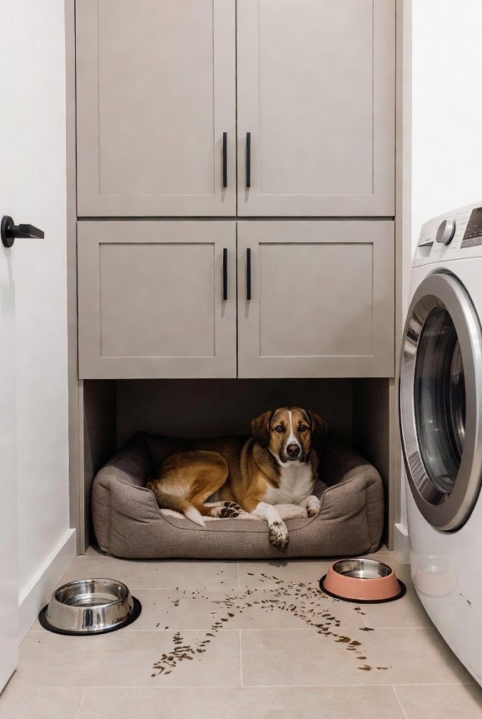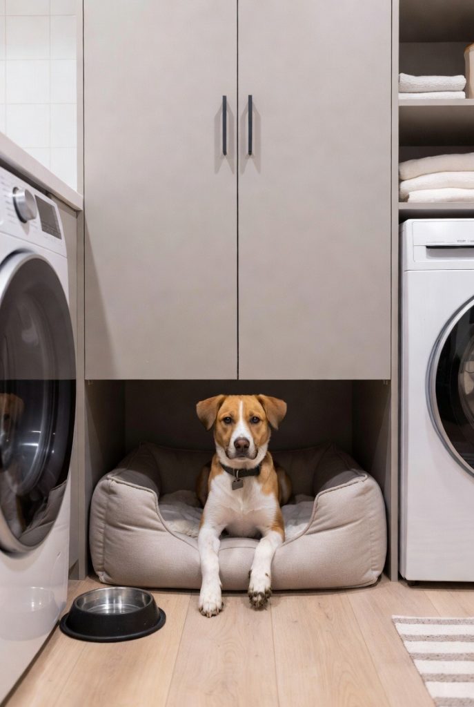 Laundry rooms are often the unsung heroes of pet organization, and incorporating a dog nook here is a masterclass in functionality. By removing a lower cabinet and replacing it with an upholstered bed, you create a quiet, out-of-the-way spot that is easy to keep clean. The hard flooring typical of laundry rooms makes it a great choice for pups who might come in with muddy paws, and having their water and food bowls nearby keeps all the pet-related activities in one easy-to-manage zone. It turns a purely utilitarian room into a cozy multi-purpose space that serves the whole family.