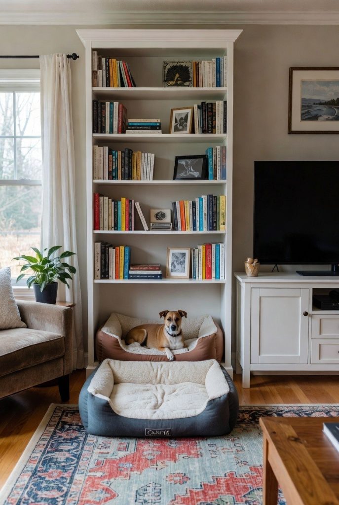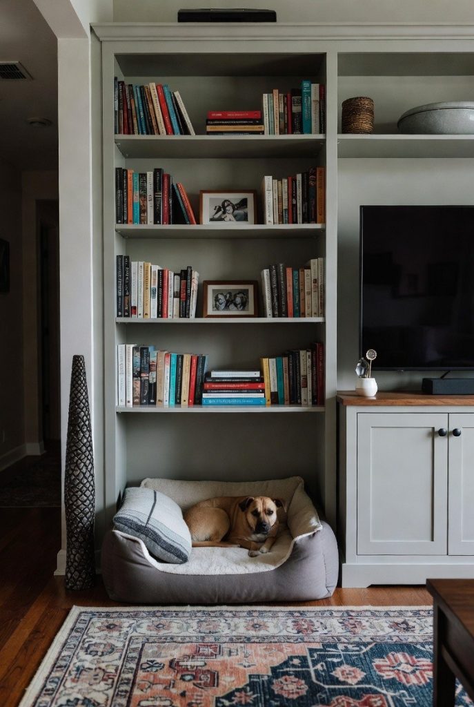If you have a floor-to-ceiling bookshelf or a large media console, you can easily sacrifice one of the lower sections to create a scholarly retreat for your dog. Removing a shelf or two provides enough height for a comfortable bed, while the surrounding books and decor help muffle the sound of the house, providing a quieter environment for naps. It is a fantastic way to keep your dog in the main living area without having a bulky, mismatched dog bed sitting in the middle of the rug. This style works particularly well for smaller breeds who enjoy being tucked into a snug, library-like atmosphere.