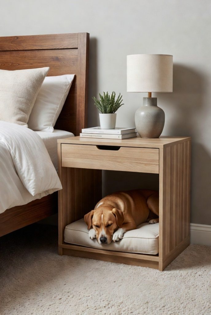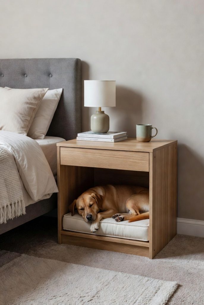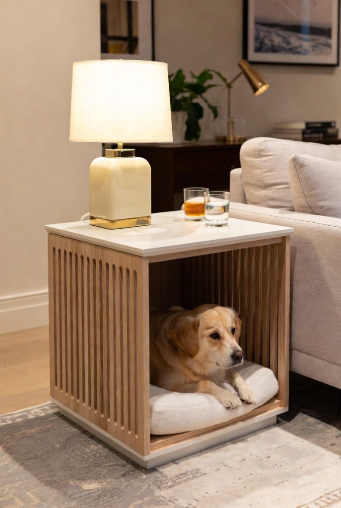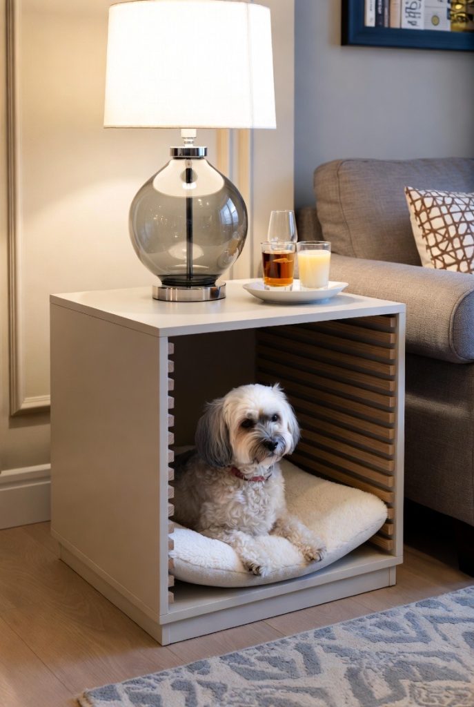This is the ultimate solution for small apartments where every piece of furniture must work overtime. A side table with a hollowed-out cabinet base serves as a chic place for your lamp and drinks on the outside, while providing a cozy, private bedroom for your dog on the inside. Many of these designs feature slatted sides, which allow for plenty of airflow and let your dog see what is happening around them while they feel safely enclosed. It is a discreet and elegant way to incorporate a dog nook into a formal living area without sacrificing style.