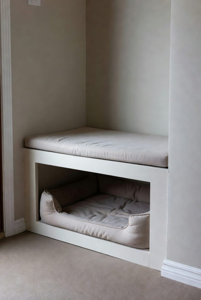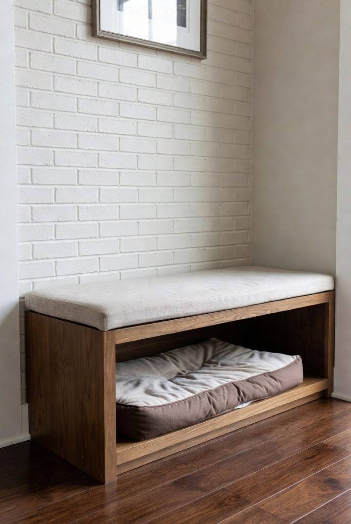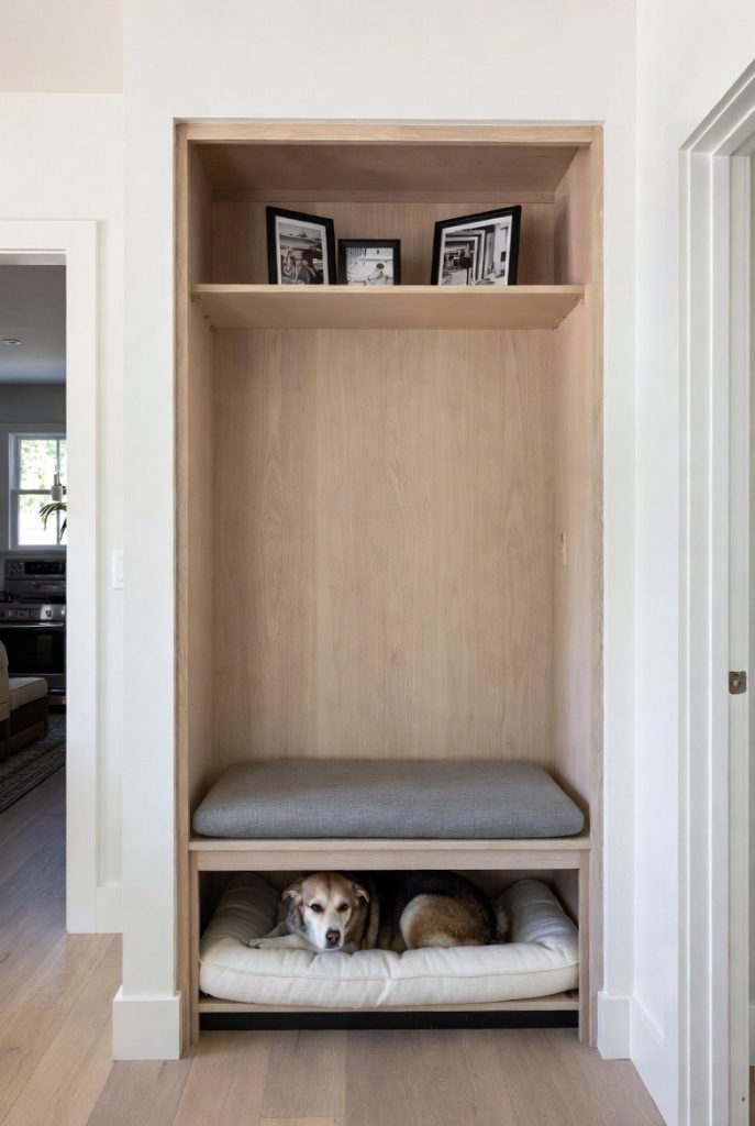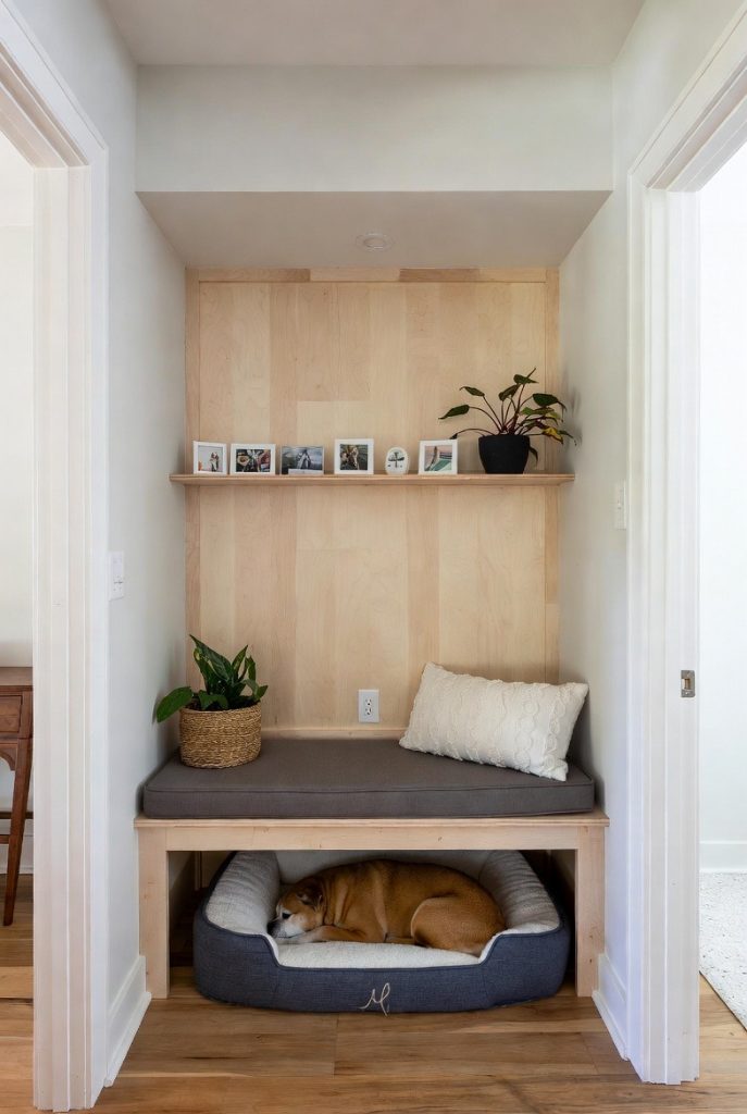 Sometimes, the best dog nooks are found in the transition spaces of a home. If you have a wide hallway with an alcove, installing a built-in bench with a hollowed-out bottom provides a perfect spot for a dog bed. The top can be used as a seat for putting on shoes or as a display area for photos, while the bottom remains a dedicated pup zone. It utilizes a space that is often ignored and turns it into a functional and charming part of the house, ensuring that your dog always has a spot to rest no matter where you are in the home.