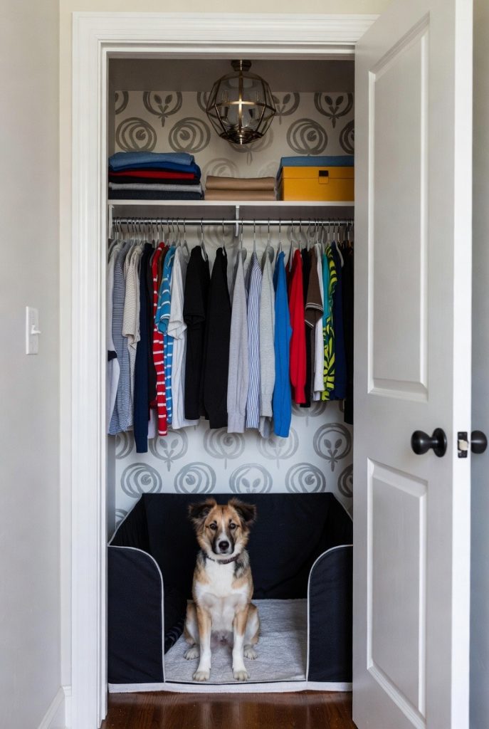 For the truly pampered pup, a corner of a walk-in closet can be transformed into a high-fashion suite. This is particularly great for dogs who get easily overwhelmed by the light and noise of the main house. By setting up a luxurious bed and a small station for their accessories, you create a quiet, temperature-controlled environment where they can sleep in total peace. It keeps all of their toys and gear in one place, out of sight from guests, and allows your dog to feel like they have their very own room within your room.