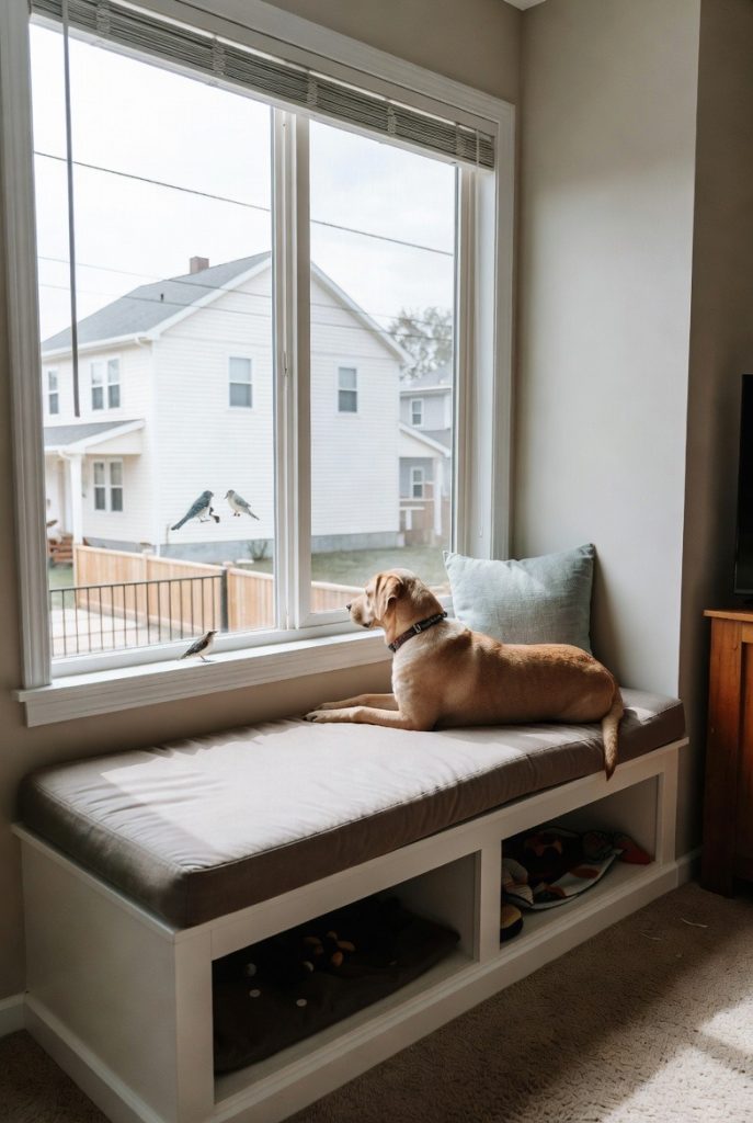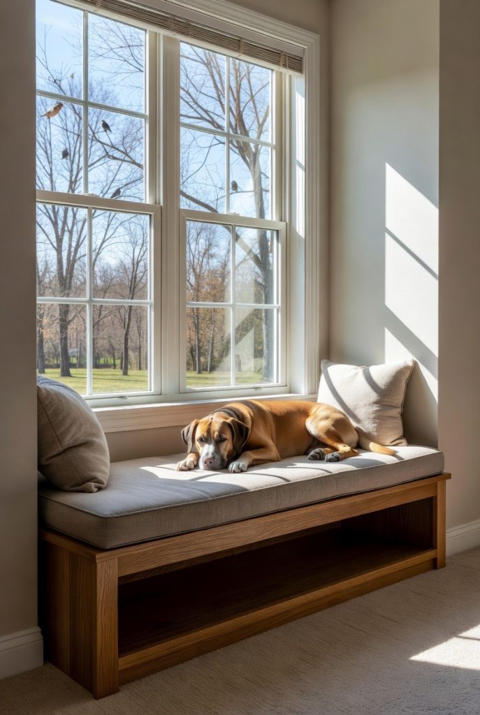 Dogs are notorious sun-seekers, and a built-in window seat provides the perfect platform for them to indulge in a warm afternoon nap. By extending the bench and adding a thick, durable cushion, you create a spot where your dog can watch the birds and neighborhood activity from a comfortable height. The space underneath the seat can also be used for hidden toy storage, keeping the room looking tidy. This nook feels bright and airy, making it a wonderful addition to a living room or a sunny bedroom where your dog can enjoy the view in total comfort.