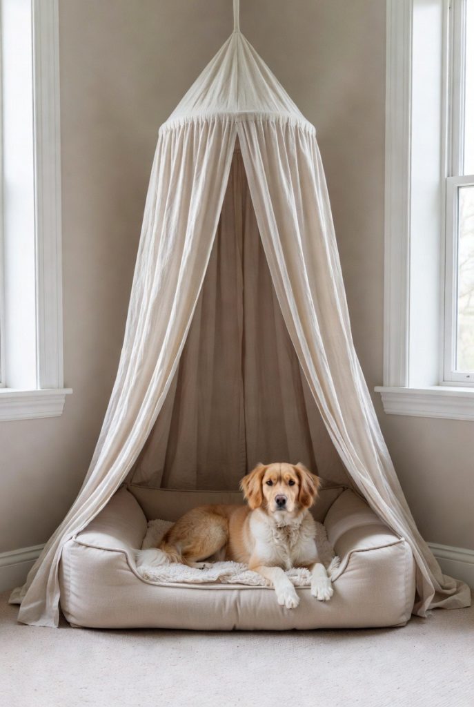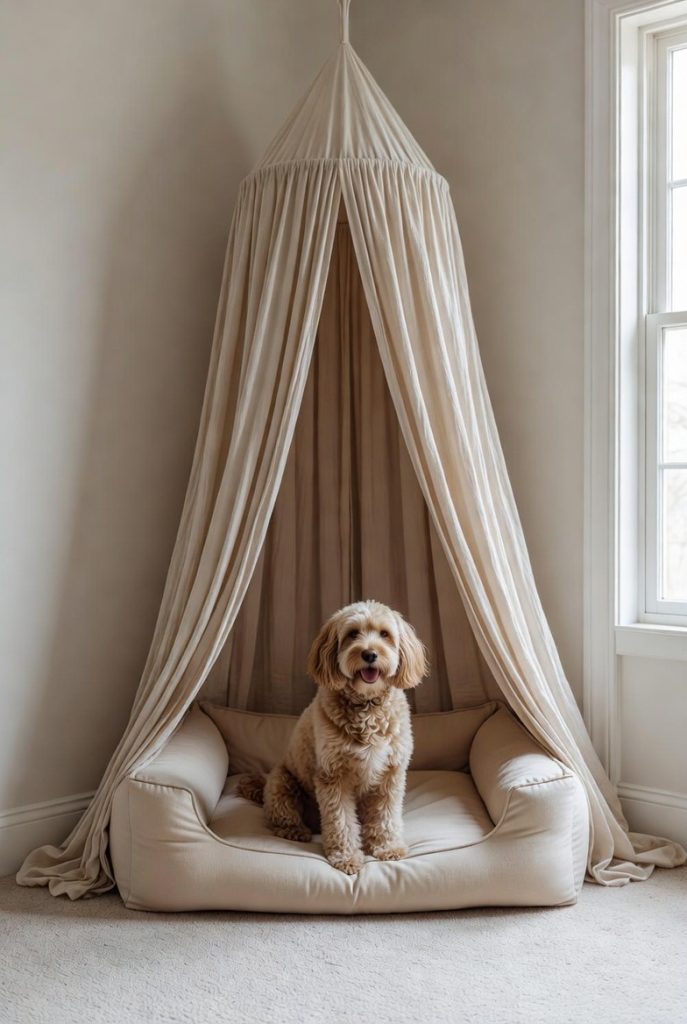 For a more bohemian or modern look, a simple corner canopy can transform a standard dog bed into a magical retreat. Using a high-quality fabric that matches your curtains or upholstery, you can drape the material over a simple frame to create a tent-like feel. This provides a sense of enclosure and privacy without the need for any major renovations. It is an easy way to soften the look of a room and give your dog a designated zone that feels special and protected. Plus, the fabric can easily be tossed in the wash to keep the nook smelling fresh.