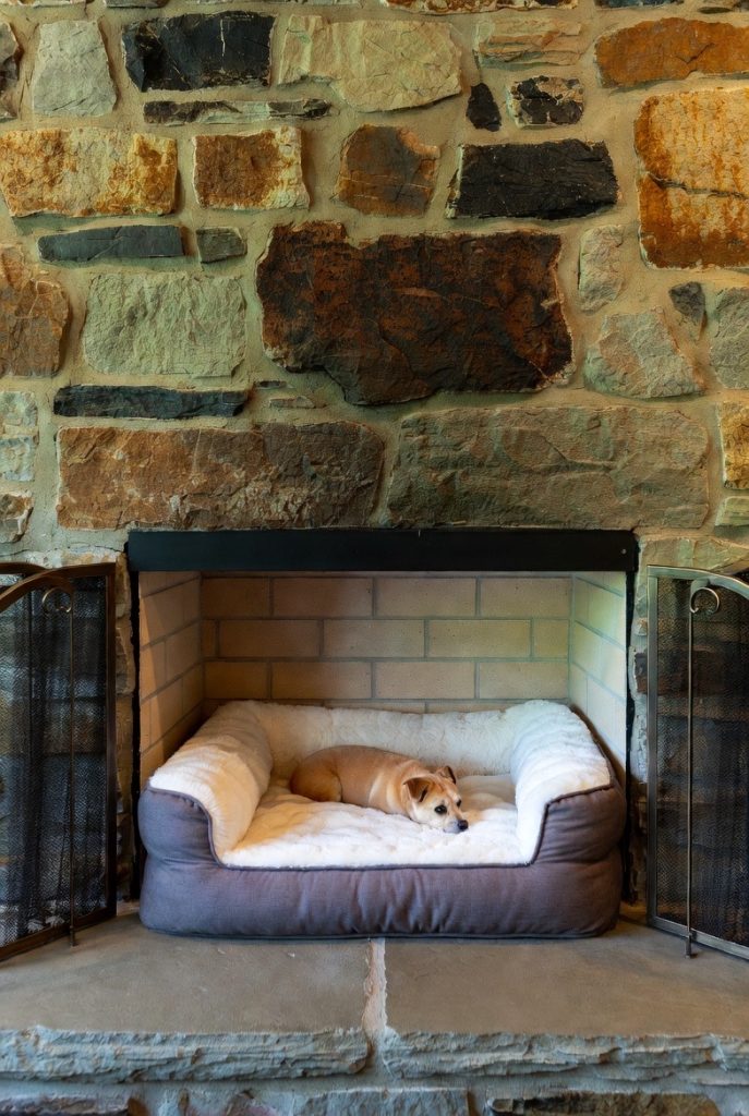 If you have a non-functioning fireplace, it is the perfect architectural feature to convert into a regal dog nook. The natural stone or brick surroundings provide a sense of sturdiness and history, while the recessed hearth offers a perfect frame for a luxurious dog bed. You can add a decorative screen or leave it open to showcase the cozy setup inside. It turns an unused part of the house into a warm and inviting feature, making your dog feel like the king or queen of the castle while preserving the character of your home.
