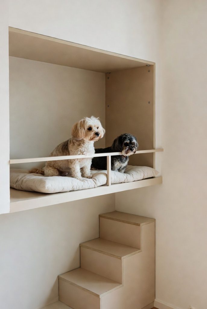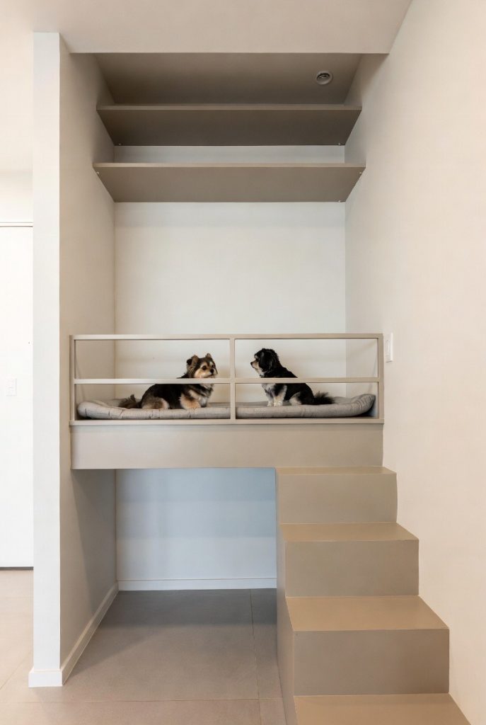 Small dogs who love to survey their kingdom from a height will absolutely adore a floating shelf nook. By installing a sturdy, wide shelf with a secure railing and a soft pad, you can give your pup a literal loft of their own. This works best in rooms with high ceilings where you can utilize vertical space that would otherwise go unused. It keeps the floor completely clear and gives your dog a unique perspective on the household. Just ensure the access is safe, perhaps via a set of matching pet stairs that blend into the room’s design.