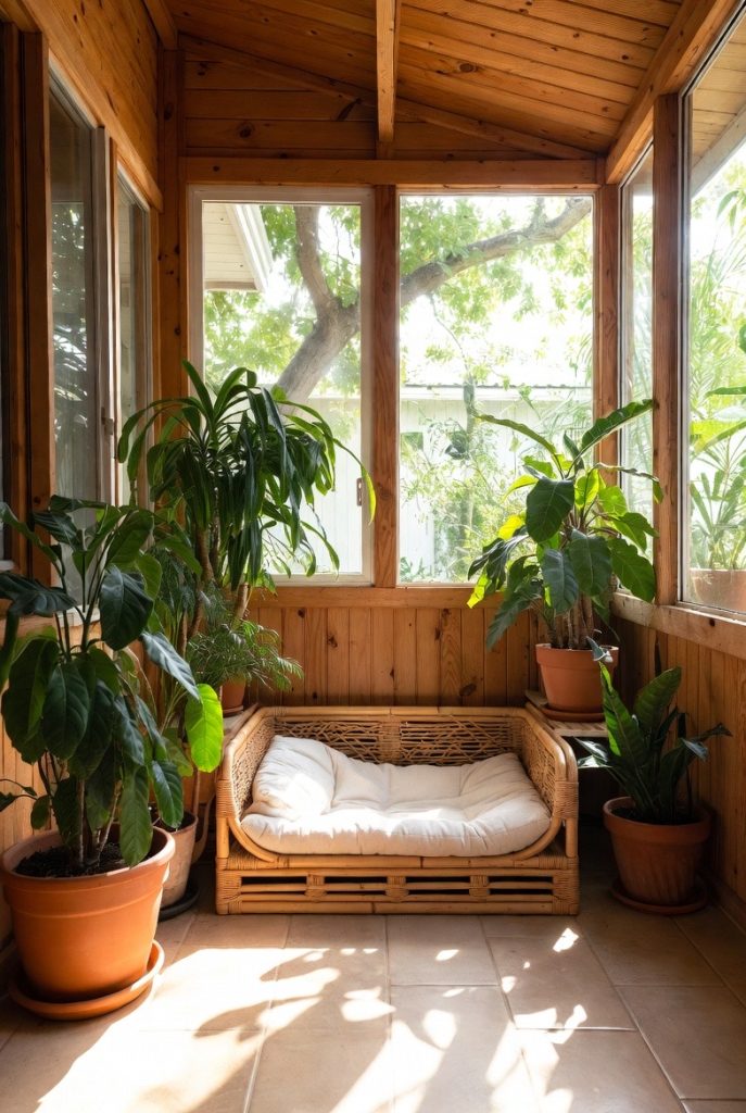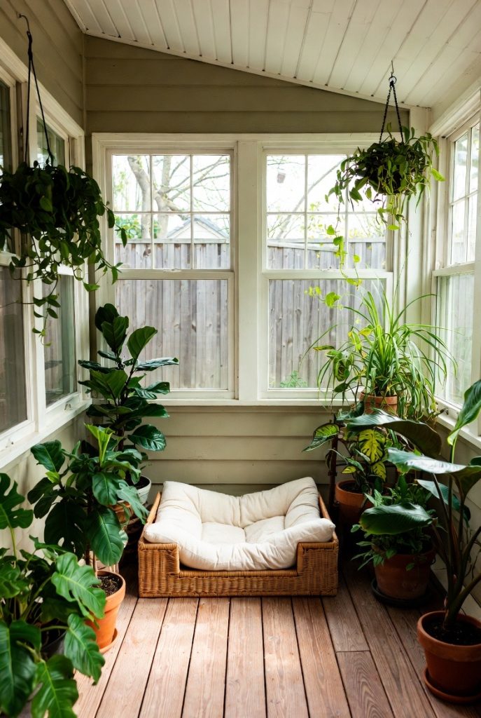 A sunroom or an enclosed porch is a fantastic location for a dog nook that feels like it is part of the great outdoors. By using natural materials like wicker, rattan, or wood, you can create a bed that matches the relaxed, garden-like vibe of the space. Adding a few potted, pet-safe plants around the nook helps it feel like a secret garden retreat. This is a wonderful spot for dogs who enjoy the sights and sounds of nature but want the comfort and safety of being inside the house, providing them with a serene place to rest.