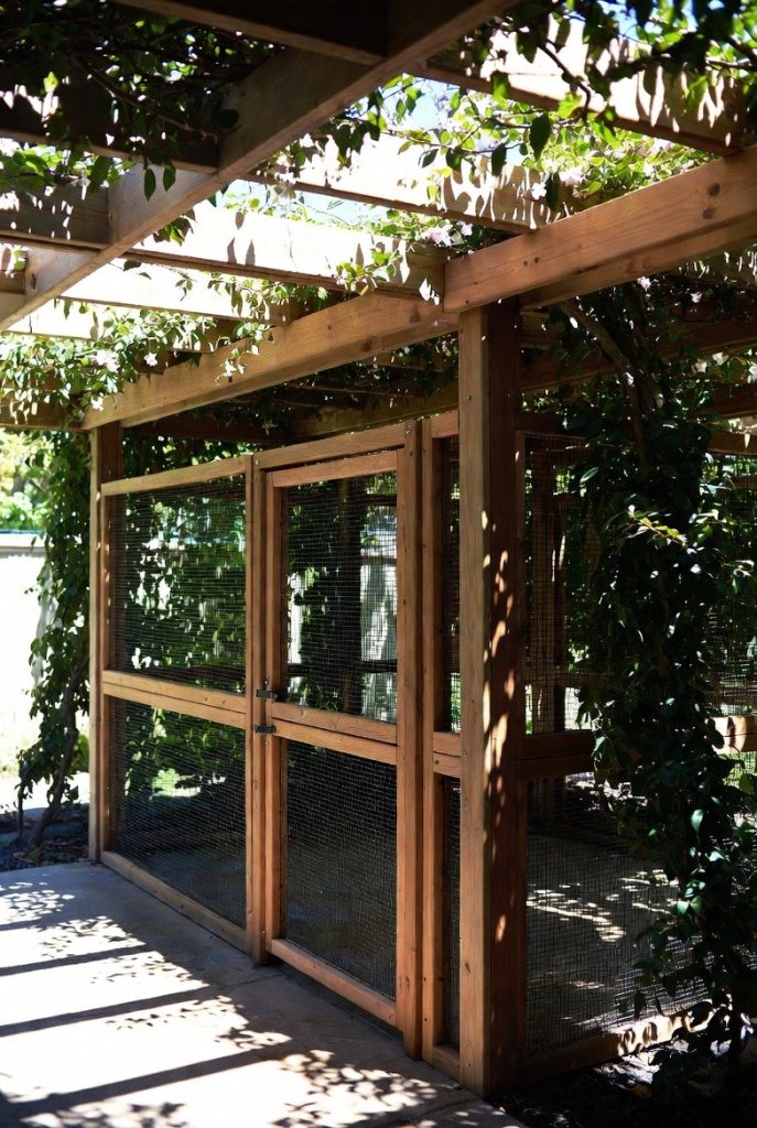 If you want your dog’s space to blend seamlessly with your own outdoor living area, a pergola-topped pen is the height of style. The wooden rafters provide partial shade and a sophisticated architectural look, while the sturdy mesh or vertical slats keep your pup secure. It feels less like a cage and more like a high-end gazebo, especially if you train non-toxic climbing vines like jasmine to grow over the top.