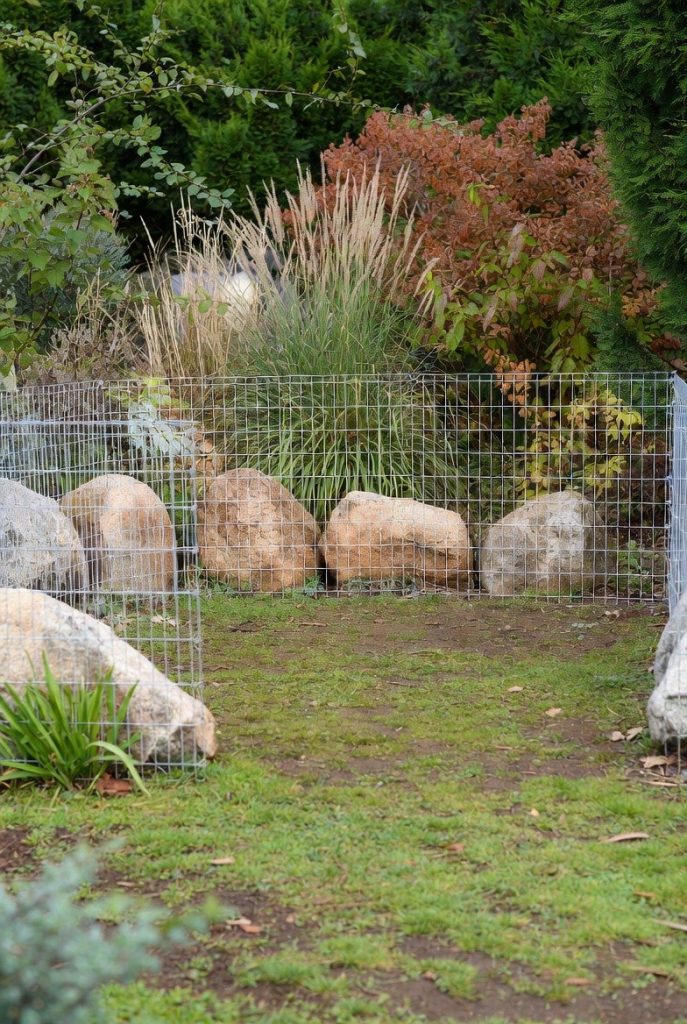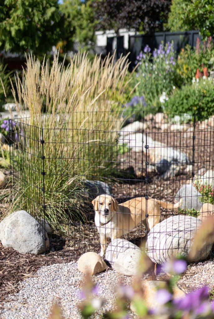 Rather than making the pen an eyesore in the middle of the lawn, this idea uses existing garden features as natural boundaries. By tucking the pen into a corner surrounded by large, non-toxic boulders and ornamental grasses, the fencing becomes almost invisible. It allows your dog to feel like they are truly part of the garden while maintaining a clear, secure perimeter.
